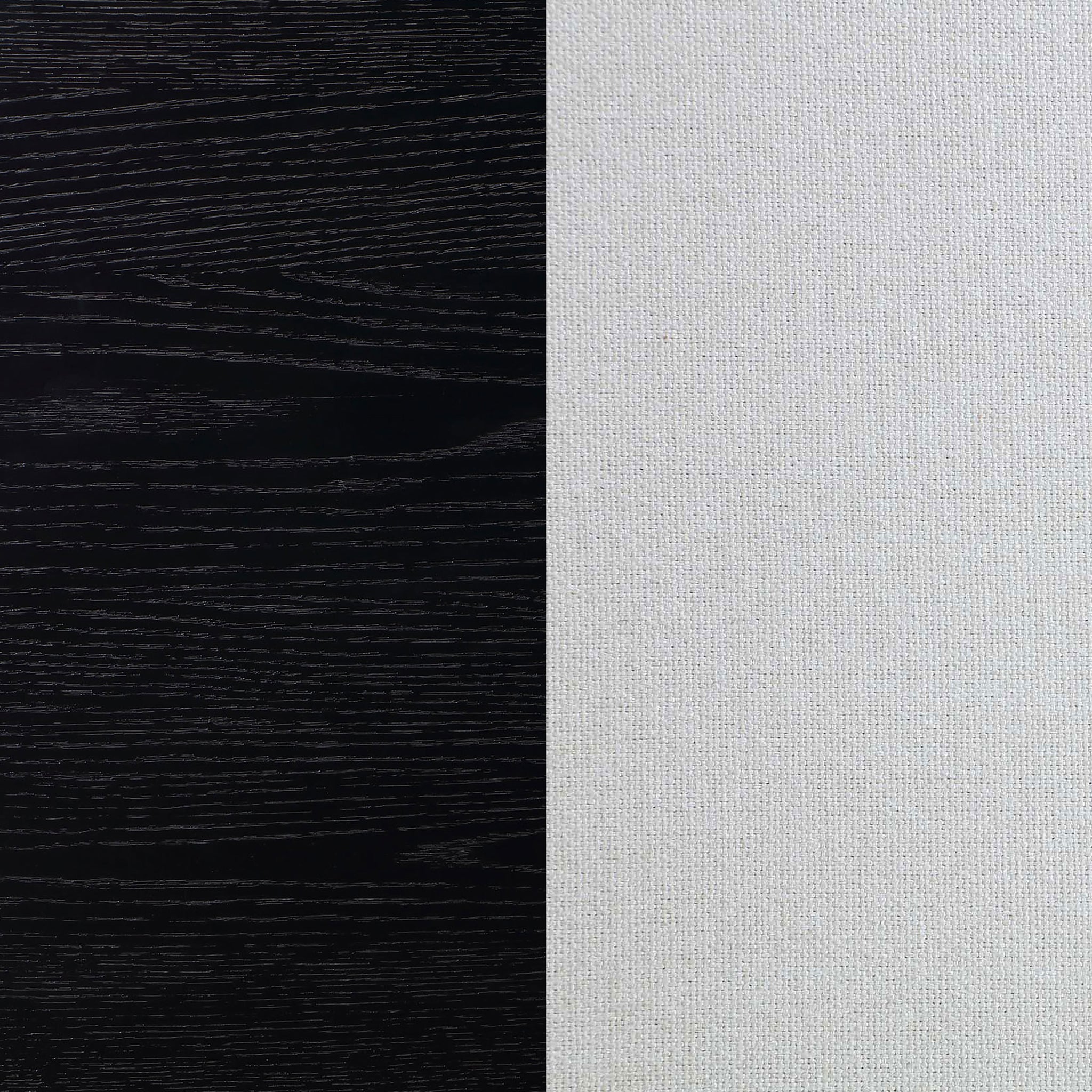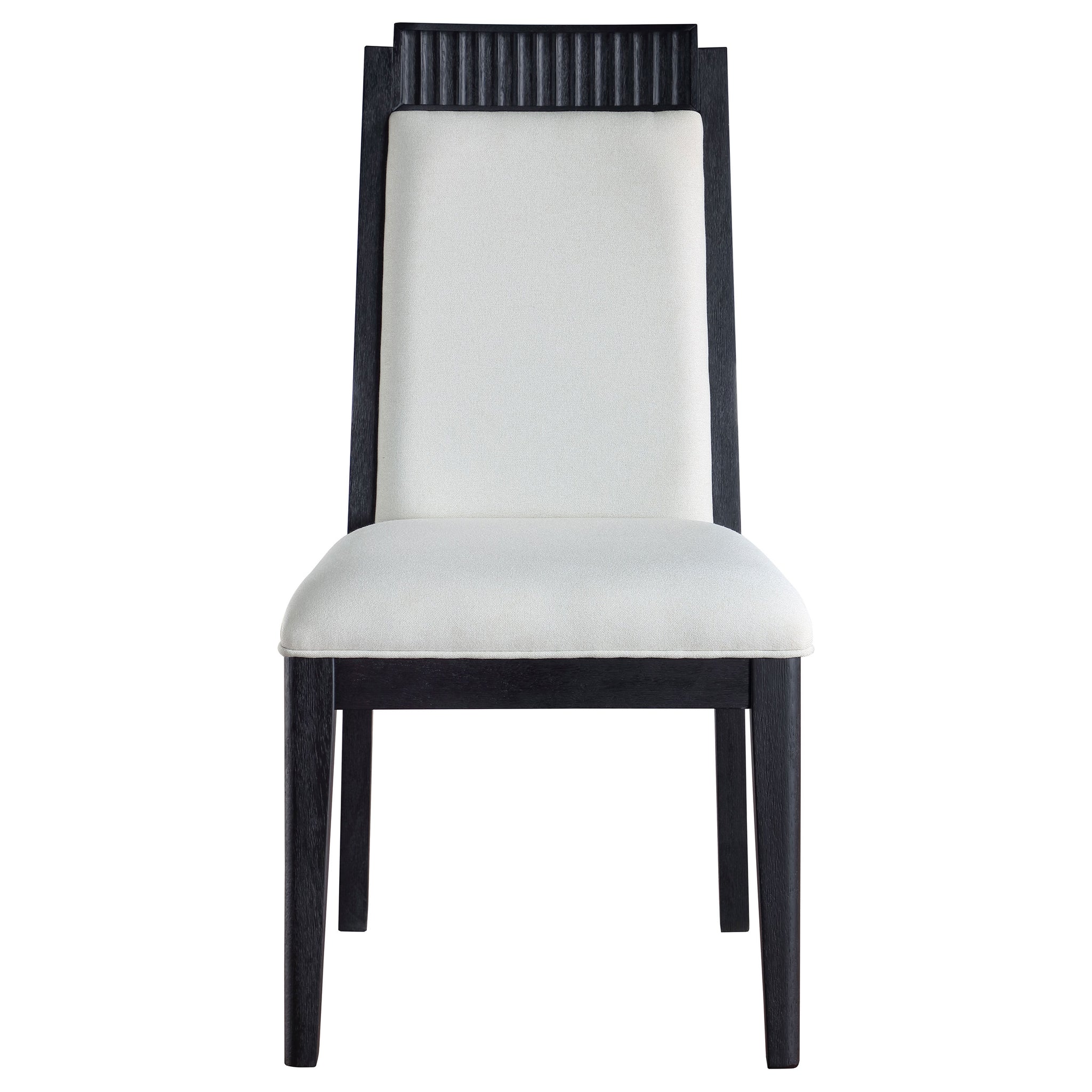 An energized style lifts the attitude in your living environment with a dining side chair adding a focal point. Your modern or transitional dining spaces transform with edgy color and finish contrasts in a chair set offering ultra-clean style and a bit of minimalism. Black finish Asian hardwood and wood products construction yields a bordered look to this chair design with soft ivory fabric upholstery on both sides of its backrest. A slightly angled side silhouette provides seating comfort and a silhouette boost. These chairs are topped with a geometric emblem featuring linear grooves, and notched edges that establish a crisp line.