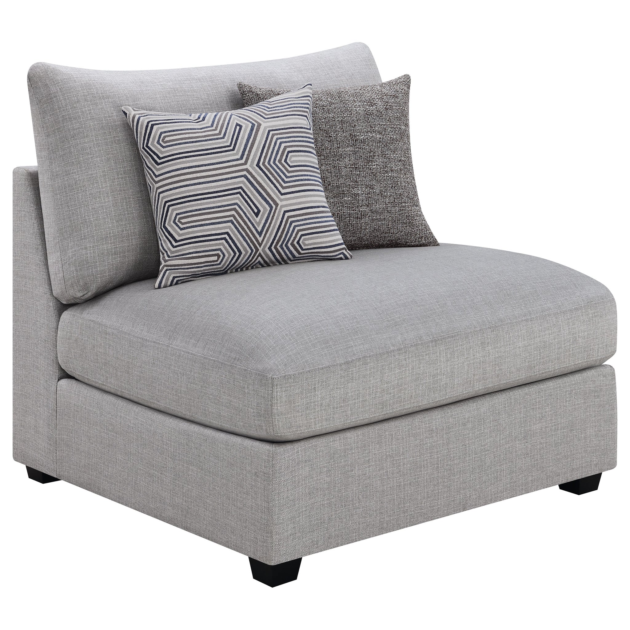 Dive into the cozy and inviting ambiance of a contemporary modular sectional sofa set. Delivering a chic balance of style and support, it shows off on-trend gray fabric upholstery and complementary patterned accent pillows that add dimension. The set includes a storage ottoman, delivering optimal versatility as it functions beautifully in place of a coffee table or creates a chaise for kicking up your feet. Wedge details are an understated addition and tapered block feet add sleek style and support. Excellent seating support and plush cushions ensure lasting comfort, perfect for the whole family or entertaining.