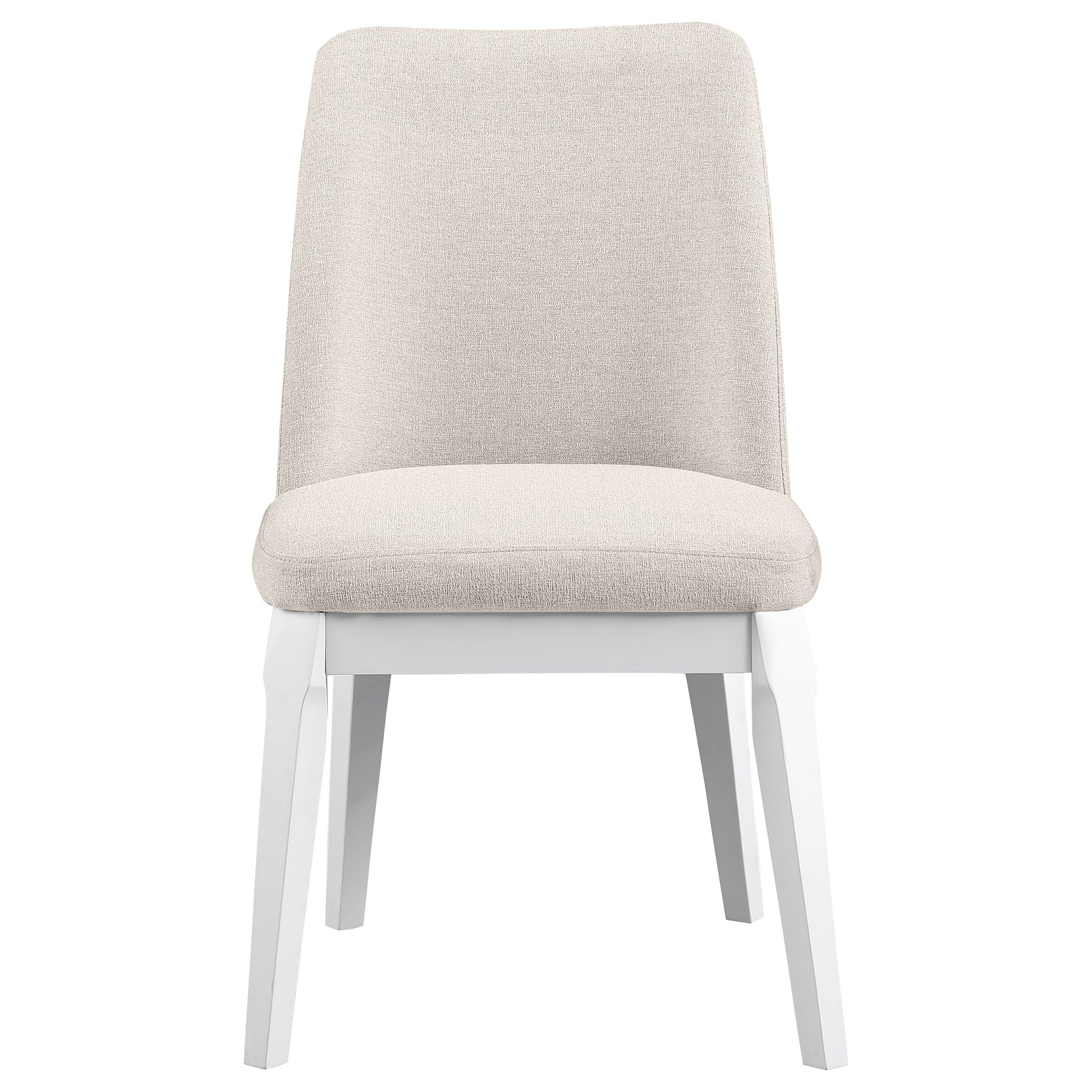 Instill a light, airy sensibility with a set of two modern dining chairs. Each side chair offers excellent comfort and support, complete with foam cushions and rubberwood framing. The set features a white finish over straight, splayed legs and an apron, creating a light, fresh base. The tall back and plush seat feature foam under soft upholstery in a neutral hue. Choose this pair of side chairs for kitchen or dining room and enjoy wonderful style and comfort.