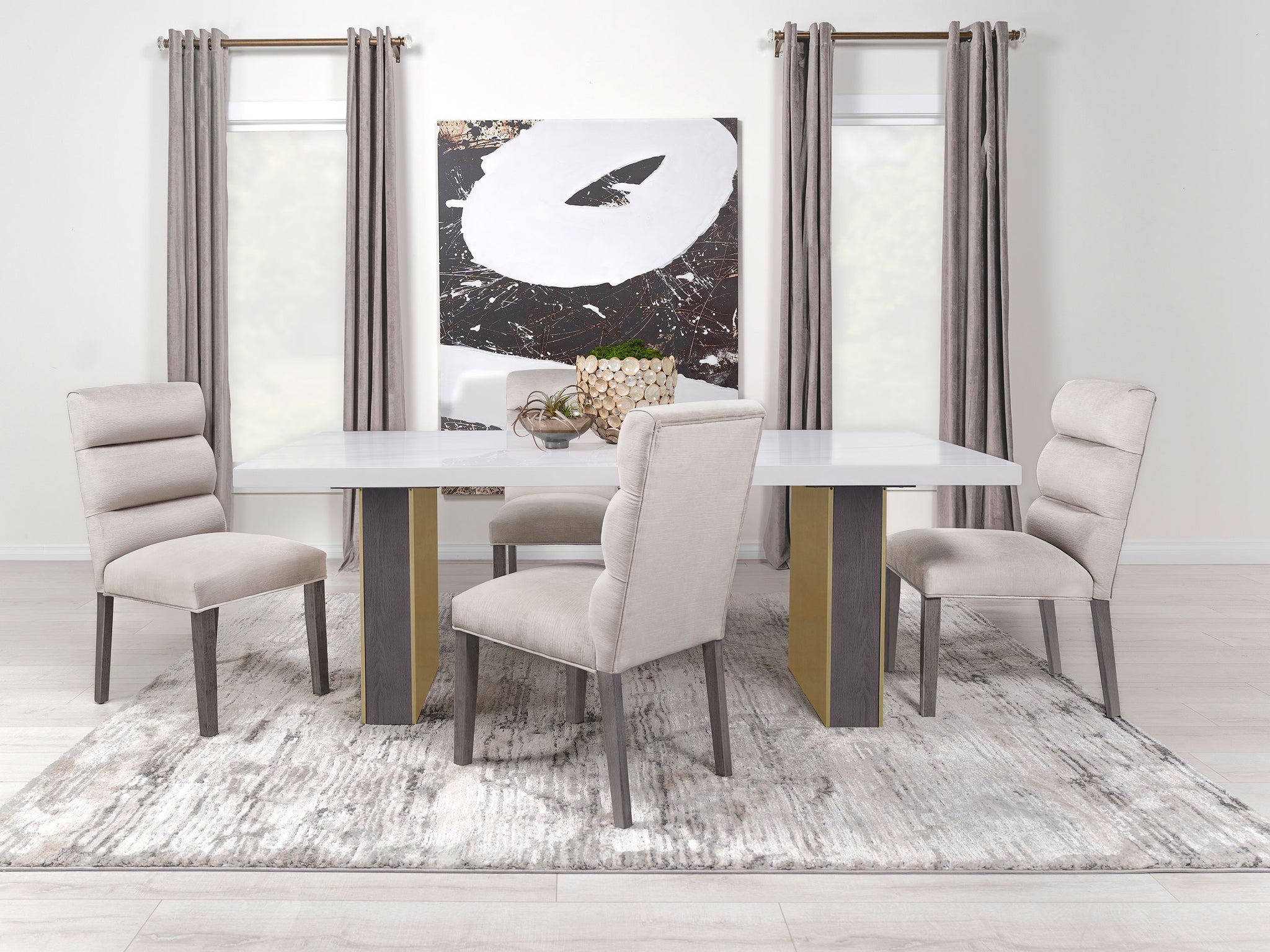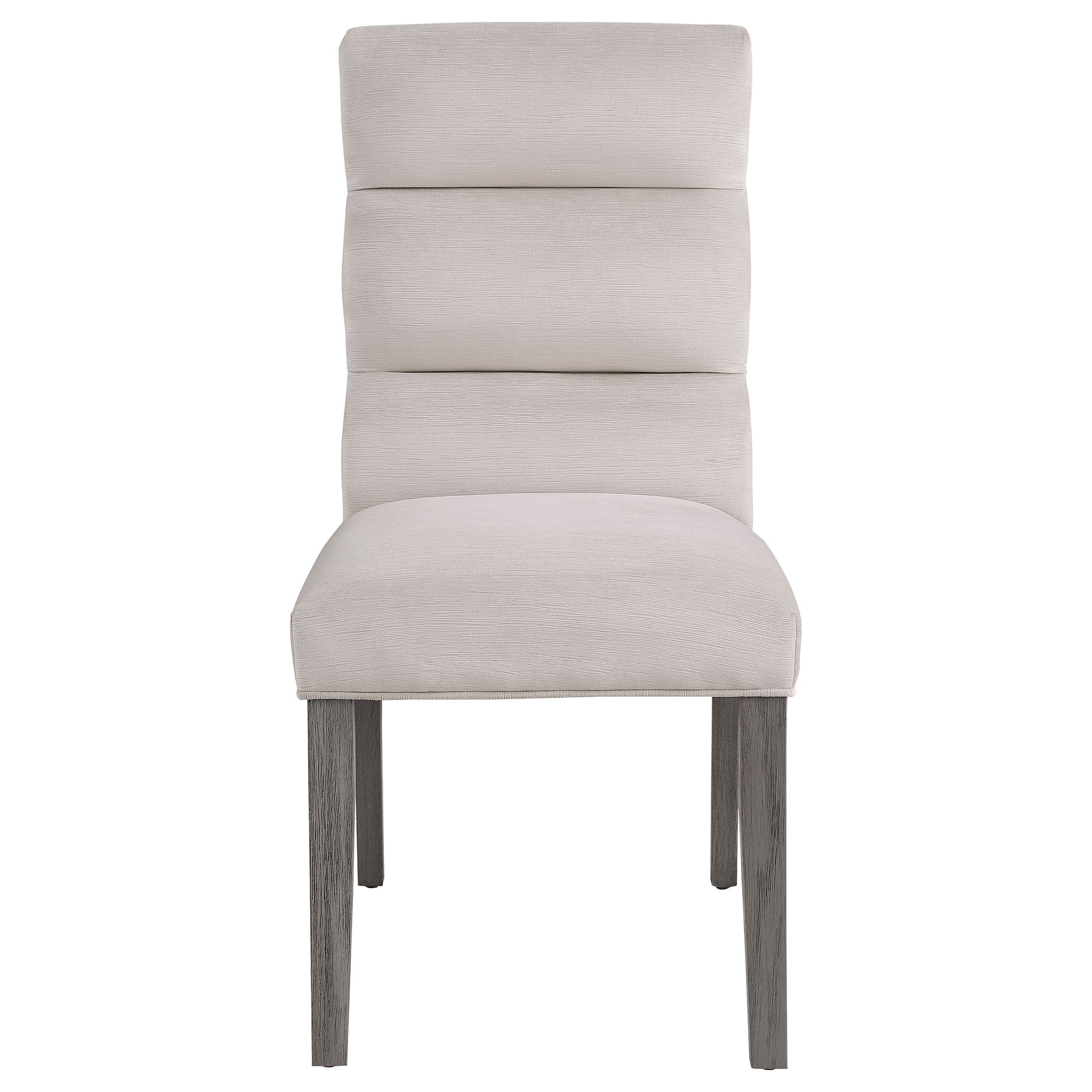 A pillowy look and feel brings ultimate comfort to a casual living space, targeting your kitchen or dining room with a light, floaty vibe, and adding a festive feel. This set of two side chairs checks all the boxes of design, comfort, and easy-living elegance standards you embrace to make a setting fashionable and functional. These chairs feature rubberwood and hickory wood framing, with a cool gray finish over slightly tapered legs. Soft fabric upholstery embellishes a cleverly styled seating unit with an extra-high back and horizontal channeling. A tight yet plump seat provides perfect balance to round out a sleek design.