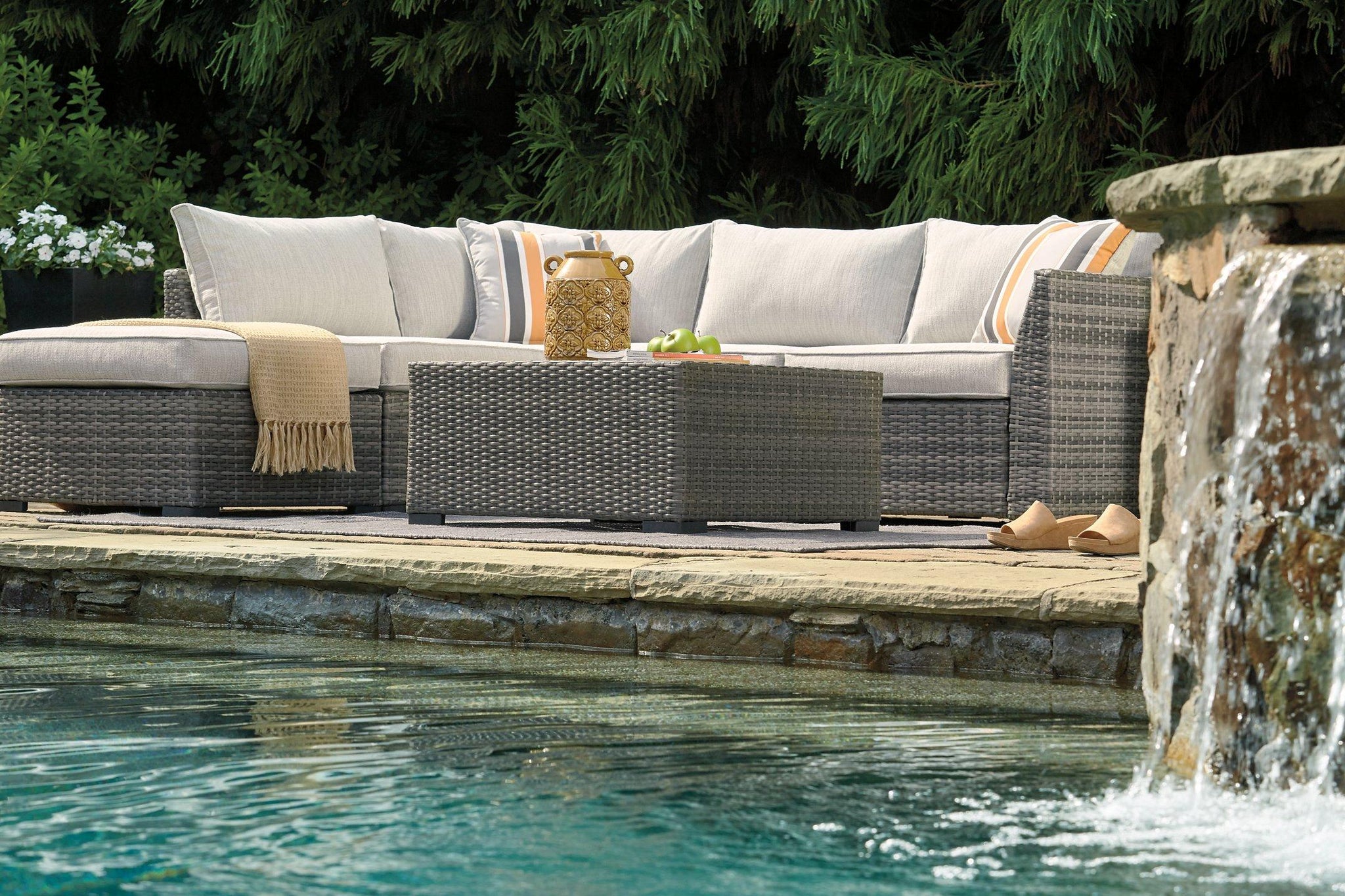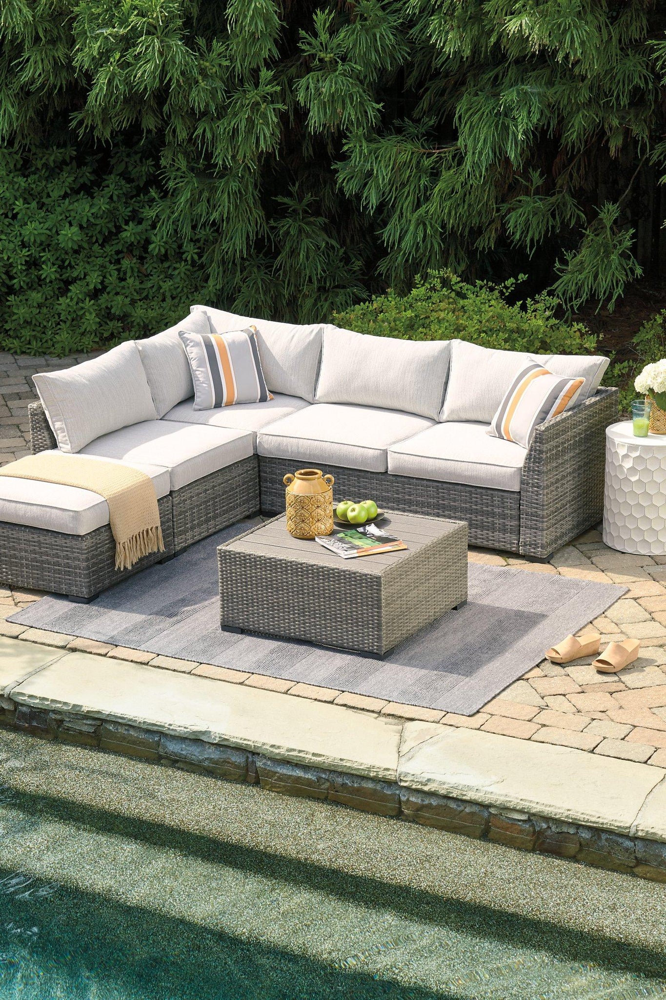 Turn your outdoor space into a sweet retreat with this 4-piece outdoor sectional. High style crafted for low-maintenance living, this decidedly clean and contemporary outdoor furniture set entices in an easy-breezy gray resin wicker over a rust-free aluminum frame for an upscale aesthetic that’s downright durable. Wrapped in high-performing Nuvella® fabric, the plush cushions are indulgently comfortable yet so carefree.