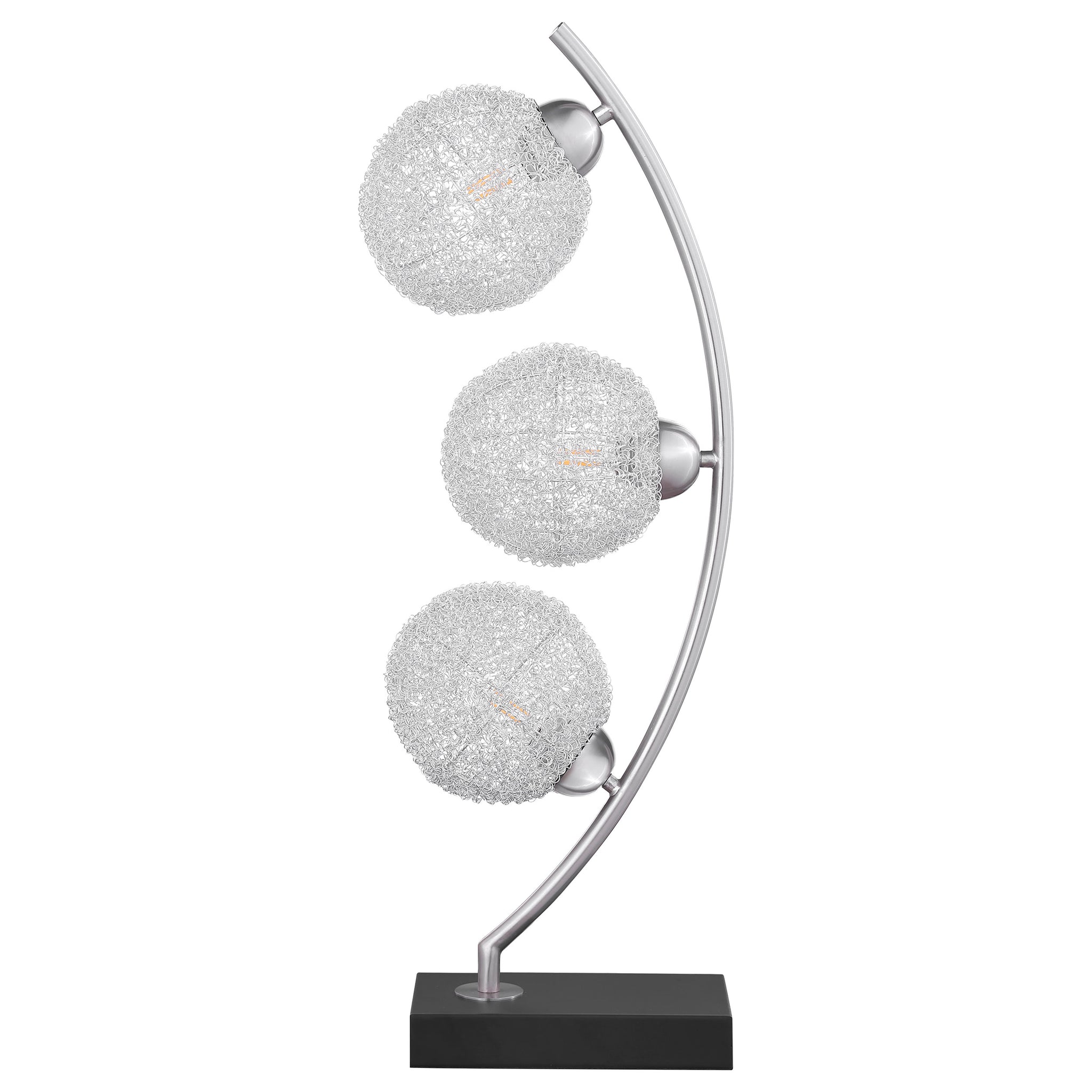 Graceful silhouetting pairs with a trio of elegant wire frame orb shades in a modern table lamp. Designed to make an impact on a console or side table, it features a fresh, modern look complete with a vertical arc frame in a chrome finish. The arc hosts three orb shades made from metal mesh, creating a striking effect of light and shadow. The light features three lights, each with an energy efficient 4-watt bulb that delivers bright illumination at a fraction of the cost. Finally, the lamp rests on a black finish rectangular base and offers a touch switch for truly seamless operation.