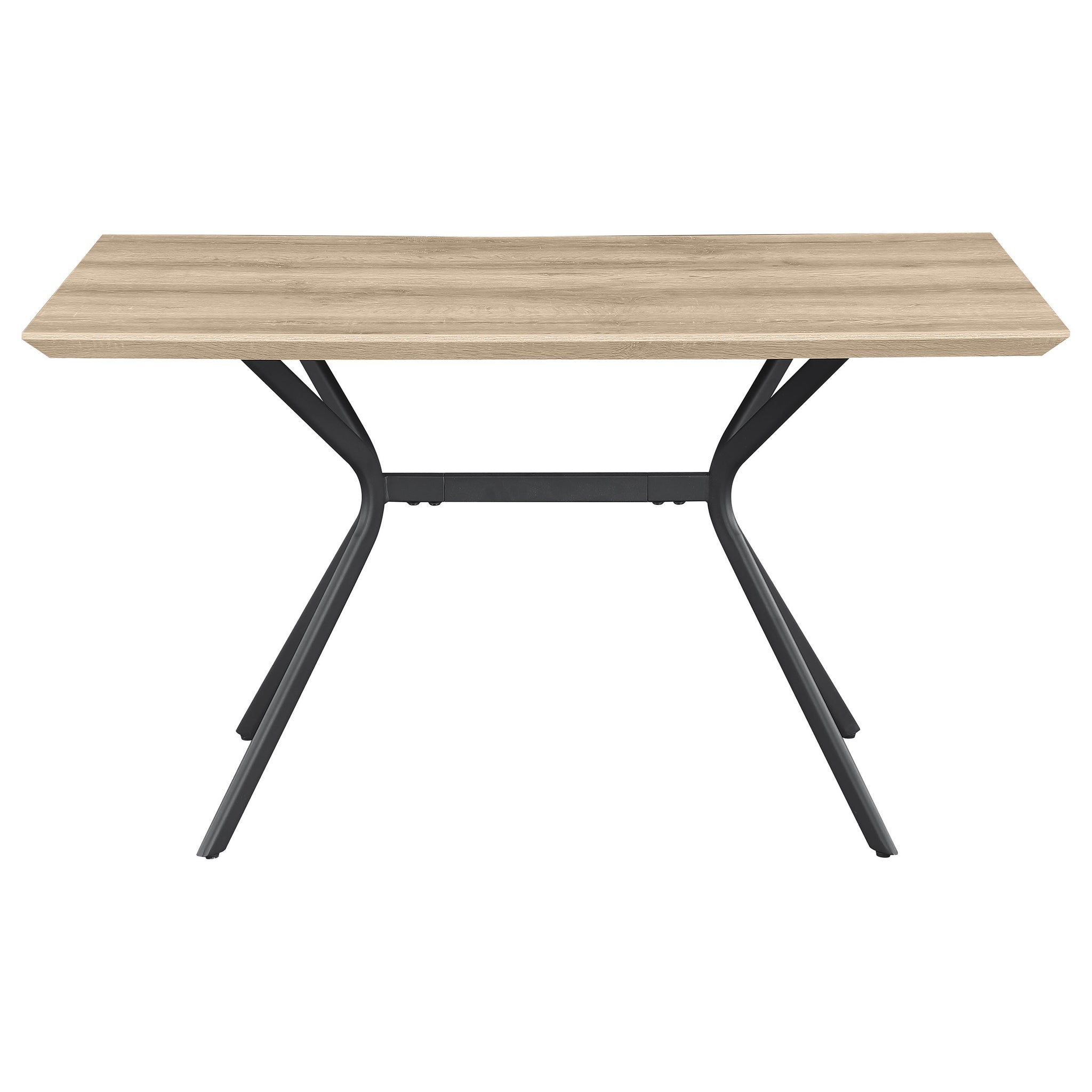 Freshen up your kitchen or dining room with a modern casual dining table. Its rectangular silhouette is versatile and stylish, perfect for multi-functional spaces like breakfast nooks and compact dining rooms. It boasts a medium brown wood grain tabletop finish, crafted with melamine for excellent durability and resistance to denting and scratches. An angled edge adds polished flair, perfect for an approachable, contemporary space. The table's base features four angular V-shaped legs with a crossbar support, all in a black finish over metal construction that provides stability.