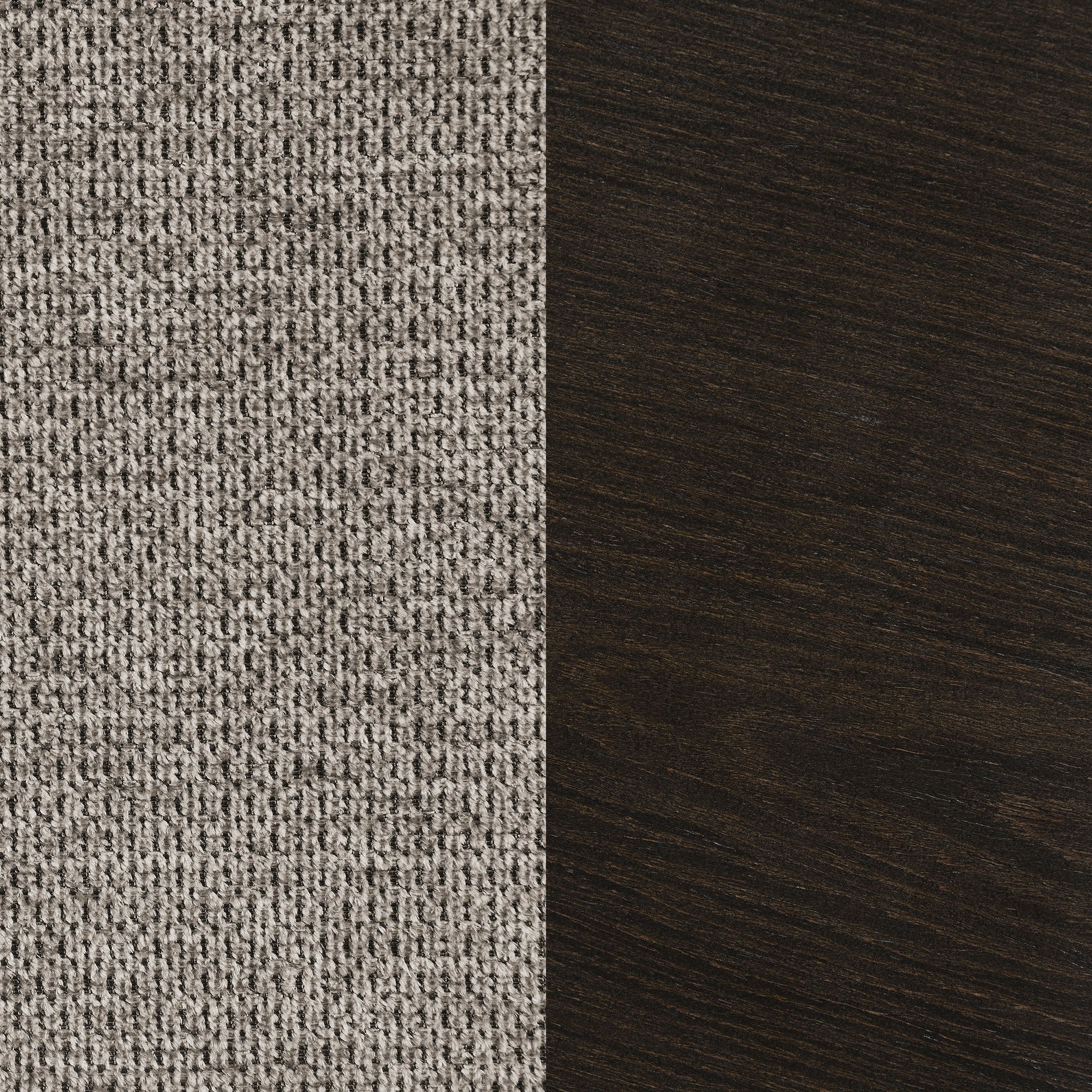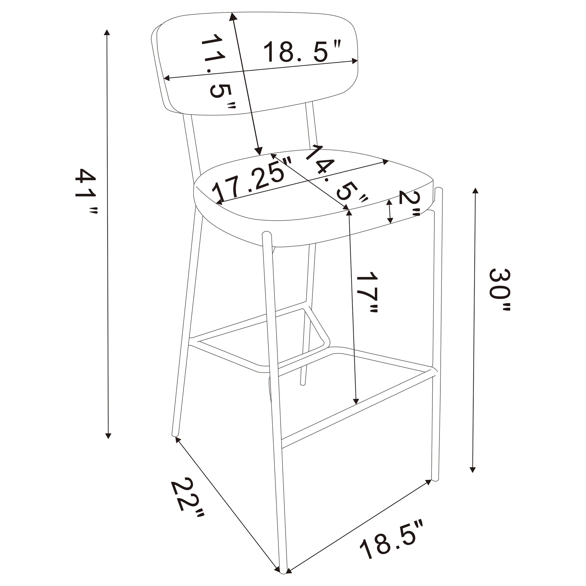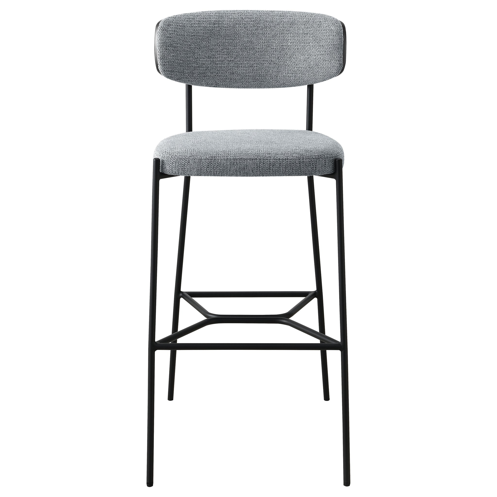 Create a relaxed and inviting ambiance at a kitchen bar or in your home lounge with a set of two modern barstools. Each boasts a durable and strong metal frame with a sandy black finish. Dark oak finish backrests complement neutral upholstery, offering foam cushioning that offers welcome comfort for family and friends. Slim structure ensures a crisp, modern silhouette for each barstool. Geometric details create a built-in footrest, perfect for leisurely enjoyment.