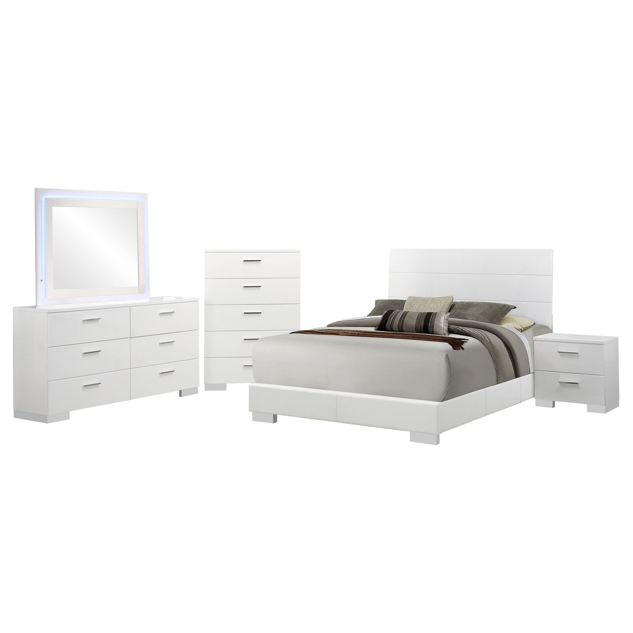 Elevate your bedroom with the sleek sophistication of this contemporary bedroom set. The panel bed features a clean-lined white high gloss headboard and a faux leather upholstered frame, delivering a refined yet modern aesthetic. Chrome-finished accents add a polished touch, while smooth-gliding drawers ensure effortless functionality. Designed for both style and durability, this set brings a fresh, minimalist feel to any space.