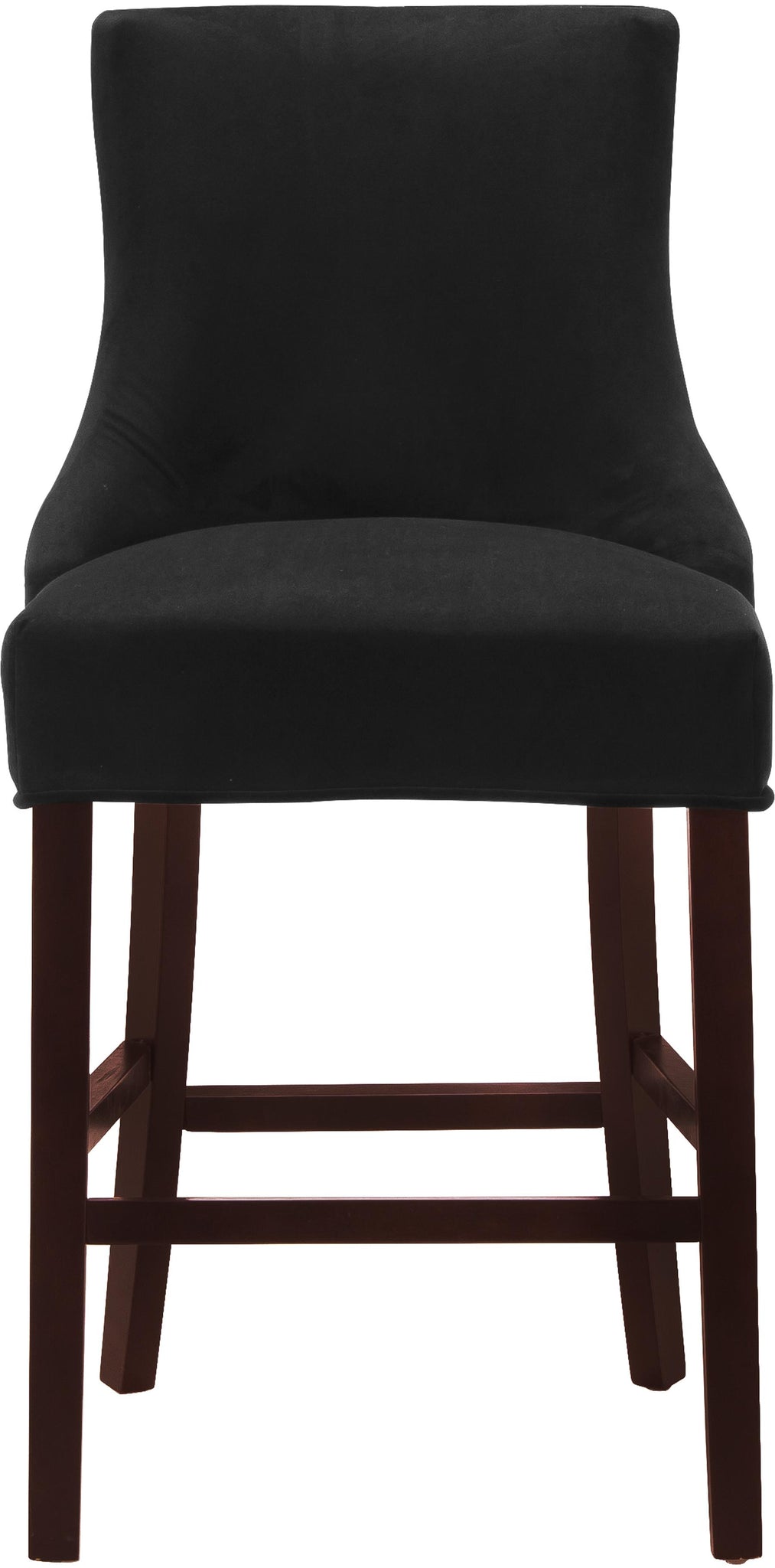 Add this Hannah Black Velvet Stool to your home bar or kitchen counter to seat guests comfortably and in chic fashion. The black velvet upholstery is thick and durable and has a slight sheen for a touch of glam. The back of the seat has deep button tufts for a posh look, while the front features smooth velvet upholstery for sleek comfort. The base is made from wood with an espresso finish and has a foot rail for extra support and comfort as you sit.