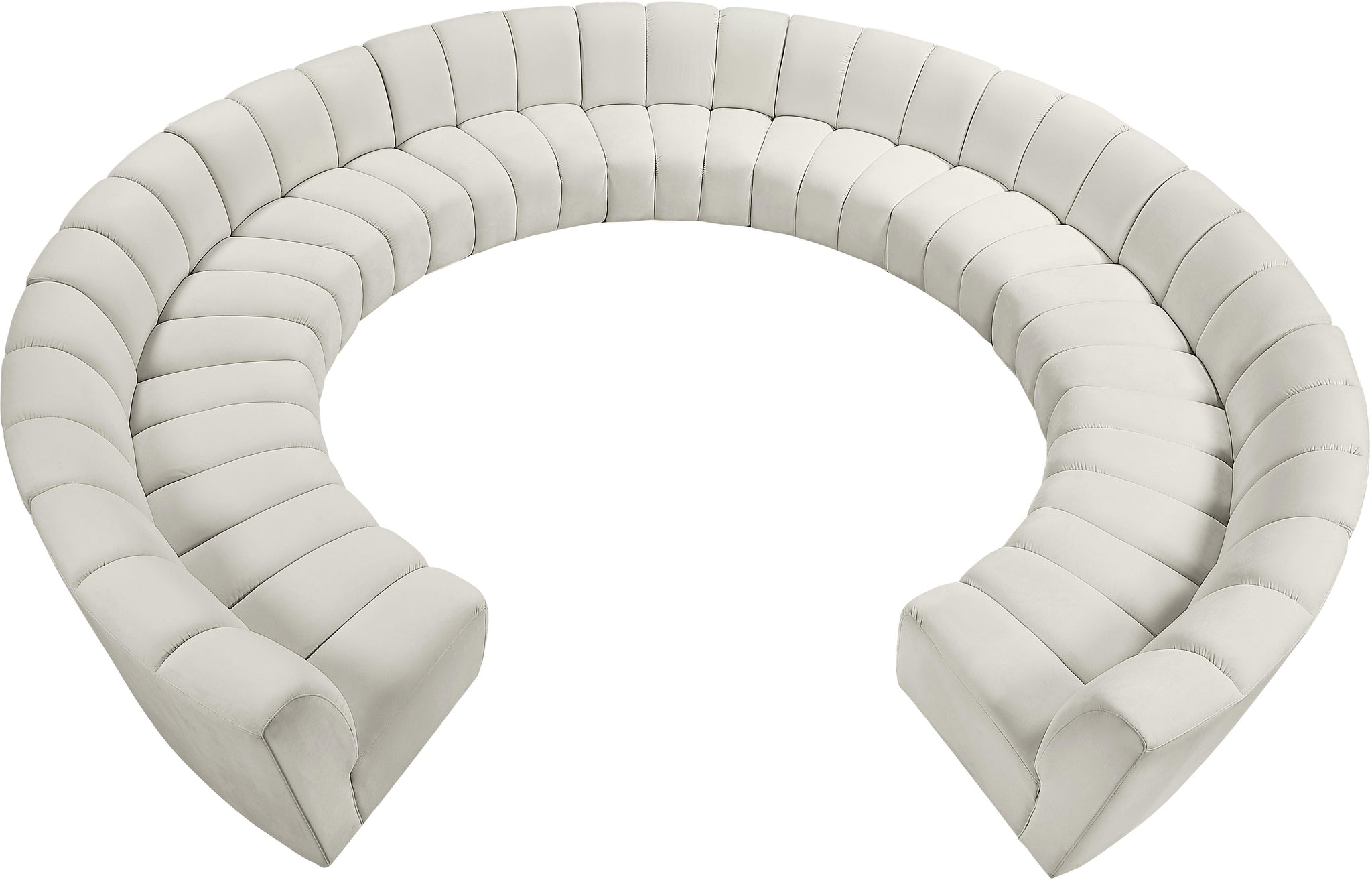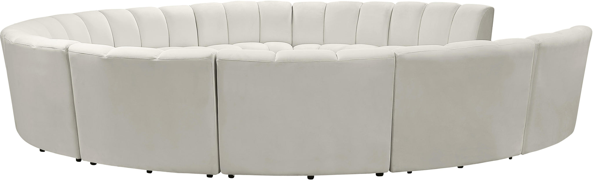 Create a seating group that works for every possible situation with this Infinity 11-piece sectional and other pieces in the Infinity collection. Upholstered in soft cream velvet material that feels great against the skin and offers long-wearing beauty, this piece fits with other Infinity items for an infinite number of combinations that get your seating requirements just right but that look just as nice when used on their own.