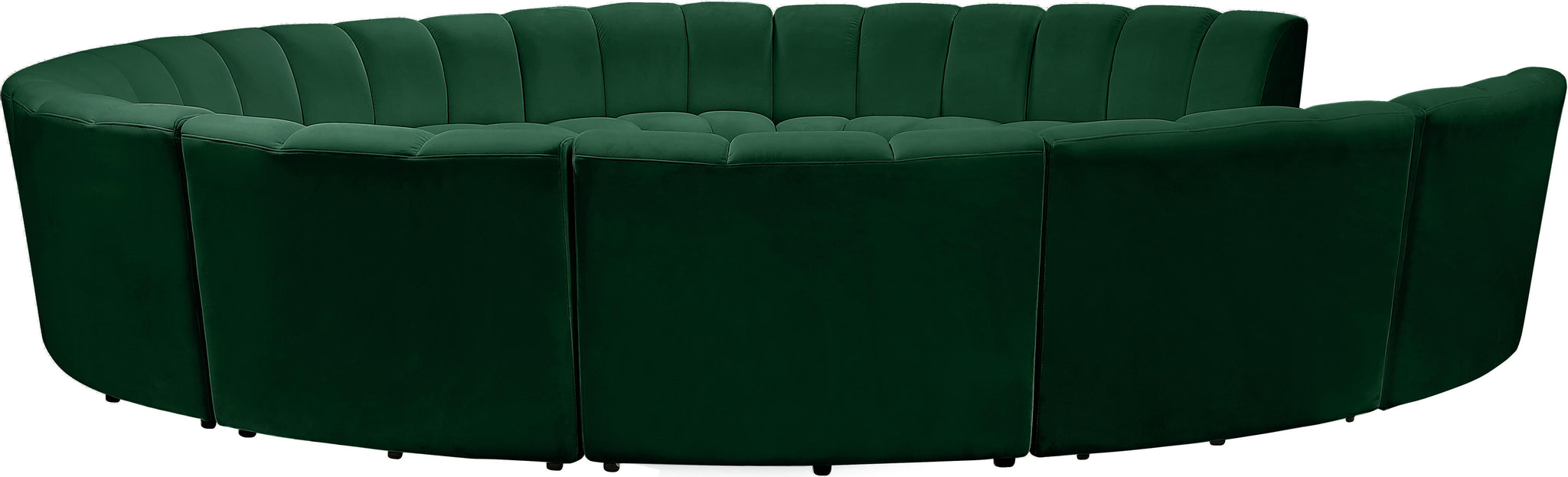 Create a seating group that works for every possible situation with this Infinity 11-piece sectional and other pieces in the Infinity collection. Upholstered in soft green velvet material that feels great against the skin and offers long-wearing beauty, this piece fits with other Infinity items for an infinite number of combinations that get your seating requirements just right but that look just as nice when used on their own.