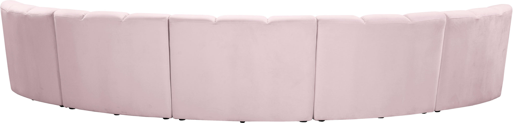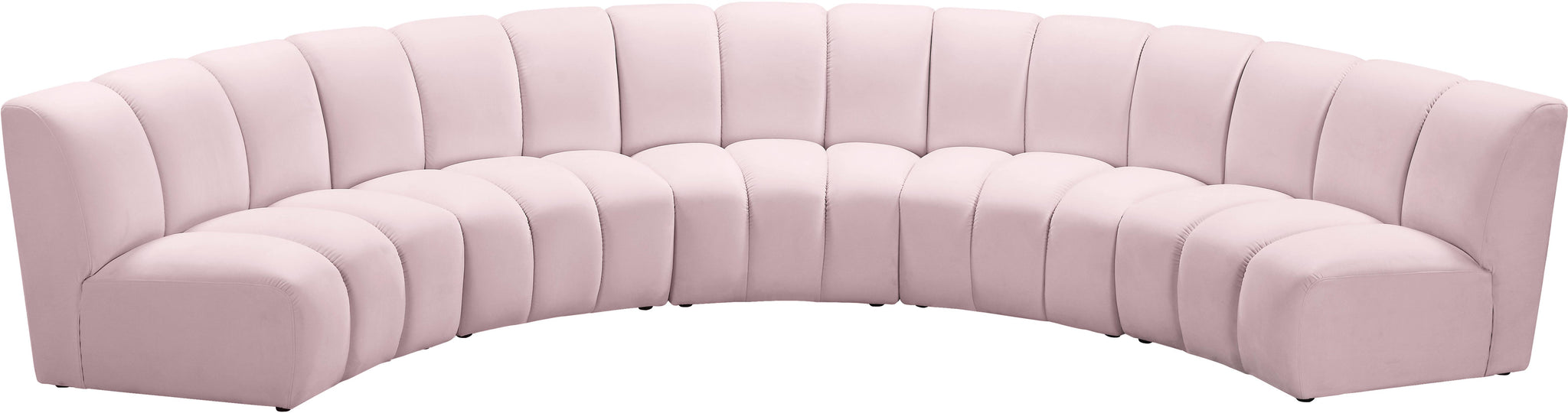 Create a seating group that works for every possible situation with this Infinity modular 5-piece sectional and other pieces in the Infinity collection. Upholstered in soft pink velvet material that feels great against the skin and offers long-wearing beauty, this piece fits with other Infinity items for an infinite number of combinations that get your seating requirements just right but that look just as nice when used on their own.