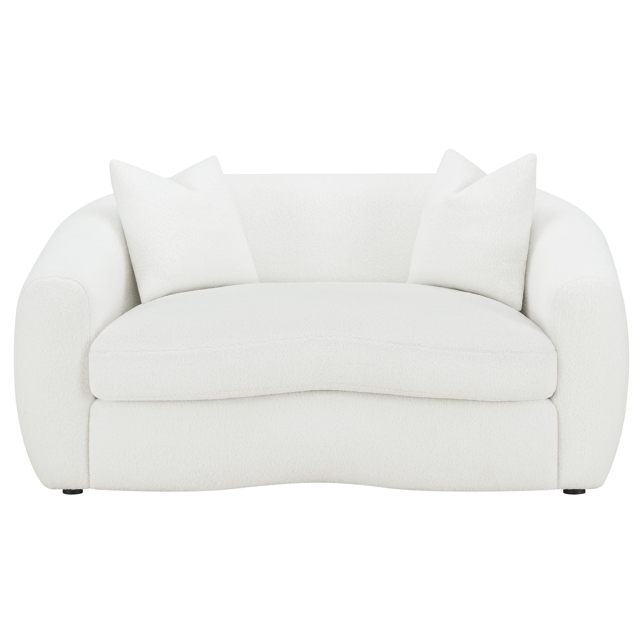 Create your modern entertaining area with this contemporary natural seating set, designed with a boucle fabric across its cloud-like contoured frames, sloped armrests and curved bench seats. Coordinating boucle accent pillows with premium faux down fill offer the finishing touch and extra comfort as contrast bold black legs hidden below elevate each seat ever so slightly.