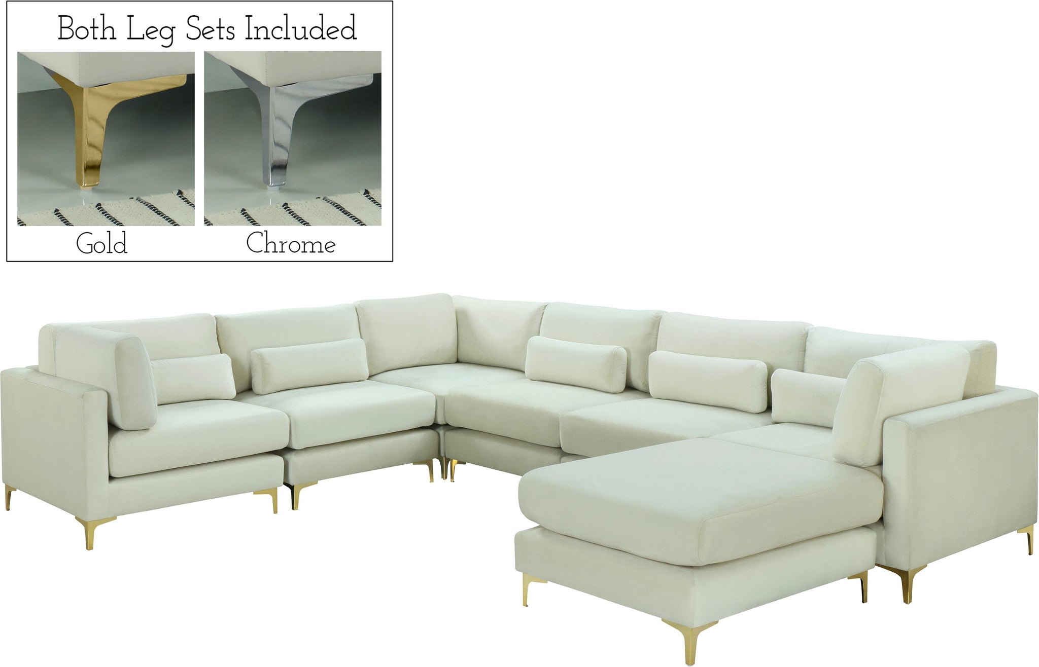 Ready to get cozy? Curl up from the welcoming confines of this Julia velvet modular sectional and you can do just that! Its soft cream velvet upholstery is soft and supple to the skin, coaxing you to relax, unwind, and sit for a spell. It comes with both gold and chrome legs for a customizable and contemporary finish. Pair this Julia piece with others to form an infinite number of seating configurations to meet your particular decorative desires and space requirements.