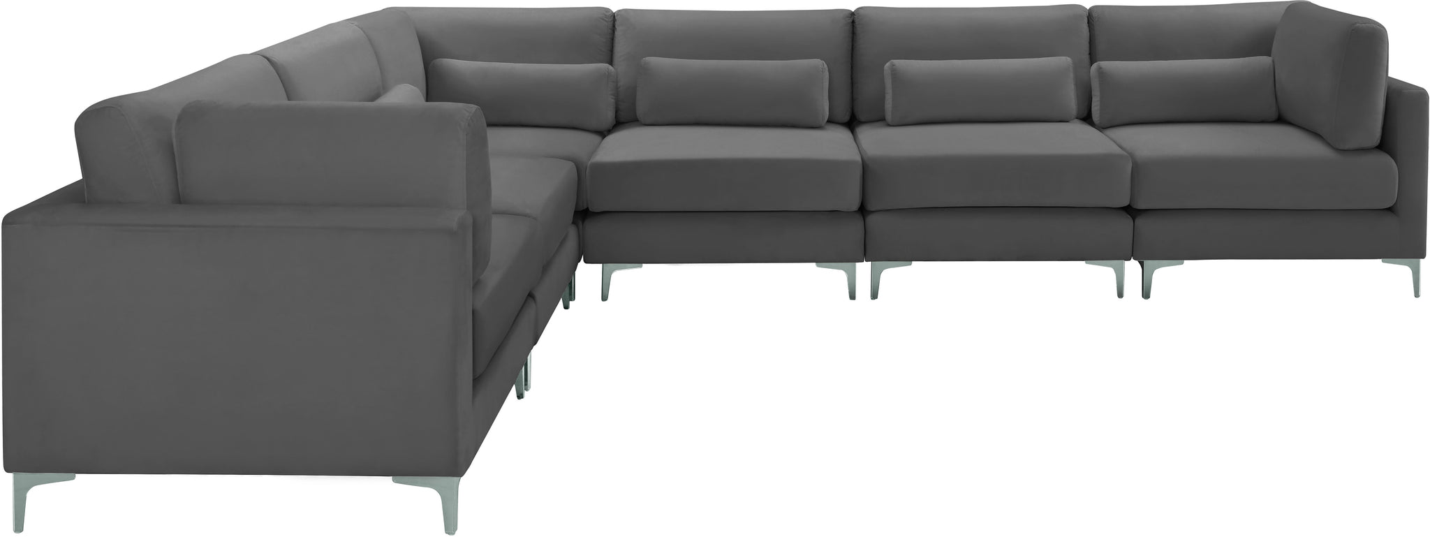 Ready to get cozy? Curl up from the welcoming confines of this Julia velvet modular sectional and you can do just that! Its soft grey velvet upholstery is soft and supple to the skin, coaxing you to relax, unwind, and sit for a spell. It comes with both gold and chrome legs for a customizable and contemporary finish. Pair this Julia piece with others to form an infinite number of seating configurations to meet your particular decorative desires and space requirements.