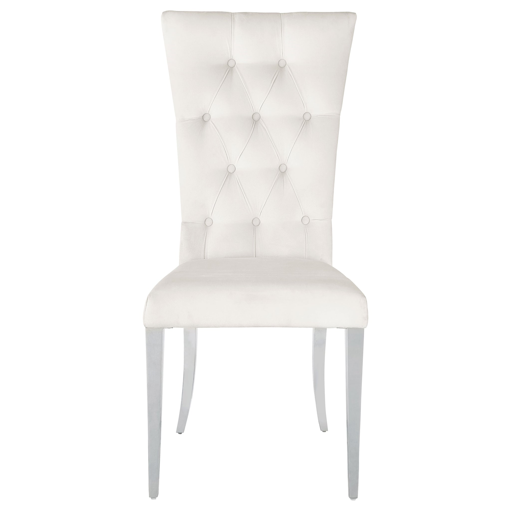 Host a party at this sophisticated modern glam dining table set, designed with a gorgeous polished chrome finish across its demilune pedestal base and four slender dining chair legs. The spacious rectangular table top presents a faux marble top and seats four comfortably and offers plenty of space for family and friends. Slide up in a Parson style dining chair, upholstered in a luxurious velvet fabric that offers a contemporary flair and soft look and feel. Button tufted backrests fan out toward the top, offering a modern expression to their classic silhouettes. Lastly, a beveled edge surrounds the table top, presenting a hint of intricate texture to the sleek aesthetic.