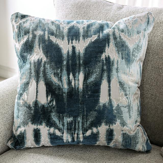 LAREDO Sofa, Beige, 100"L X 44"W X 40"H, 125lbs. The transitional appeal of this sofa and love seat combo is hard to ignore. Borrowed classic elements like the rolled arms and nailhead trim are combined with a more modern approach to comfort--the loose backs are removable and plush, while the throw pillows are bright and colorful. With a slight sheen to them, the blue tones on the accent pillows pop against the beige line-like fabric, which just might be the needed flair to take your living room decor a notch higher.