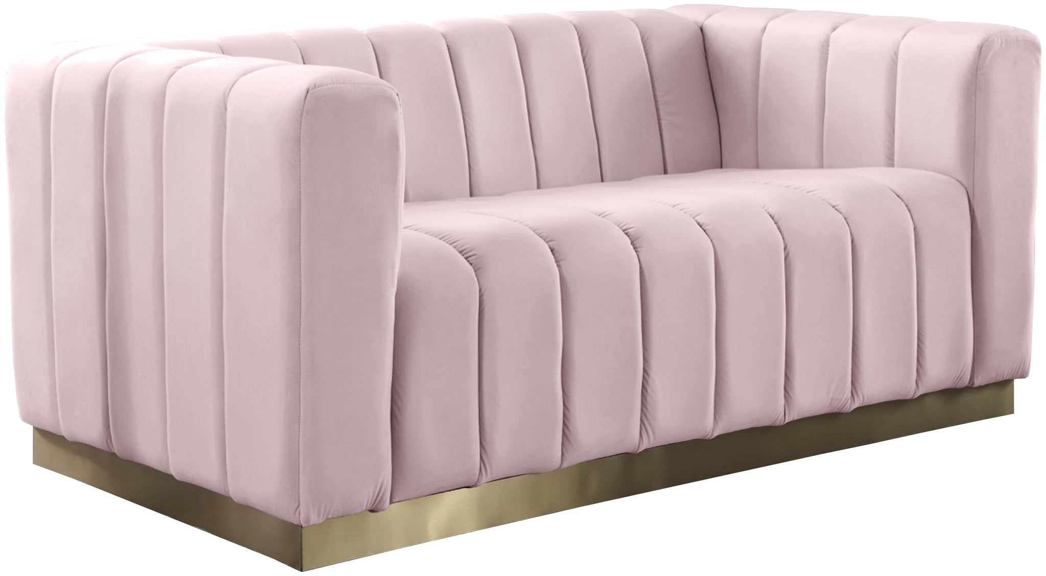 Seat guests in the epitome of comfort and style with this Marlon velvet loveseat. This piece is just the thing to showcase your modish style while ensuring total enjoyment from all who are lucky enough to relax on its channel tufted seats. The soft pink velvet upholstery adds a beautiful touch to your space and feels great against your skin while the brushed gold stainless steel base lends it a contemporary finish.