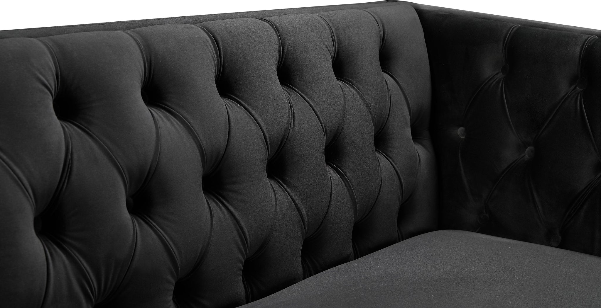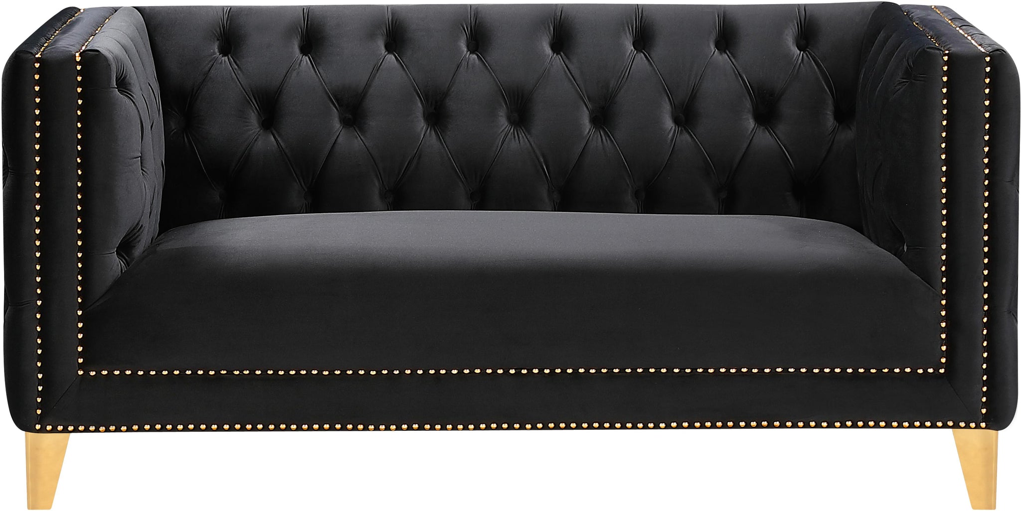 Upholstered in soft black velvet, this Michelle love seat is sumptuously glamorous. Designed for upscale living, this chair features rich gold nail head trim and gold iron legs that keep it grounded in contemporary beauty. Tufted material covers every inch of this unit, and button tufting ensures that the unit stays plump and comfortable and holds up well to continual use. Pair it with other items in the collection for a cohesive look.