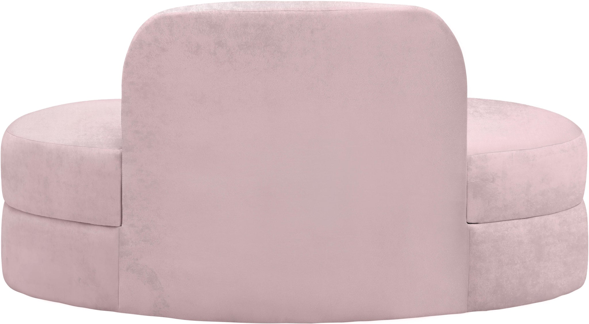 Relax and unwind from the soft comforting confines of this Mitzy velvet love seat. This elegantly eye-catching chair has a lot to offer with its uber contemporary design and its soft pink velvet. Its unique kidney-shaped design lends it to modern d?�cor themes with ease, and the upholstered base provides sturdy support for you as you sit and destress in front of the TV.