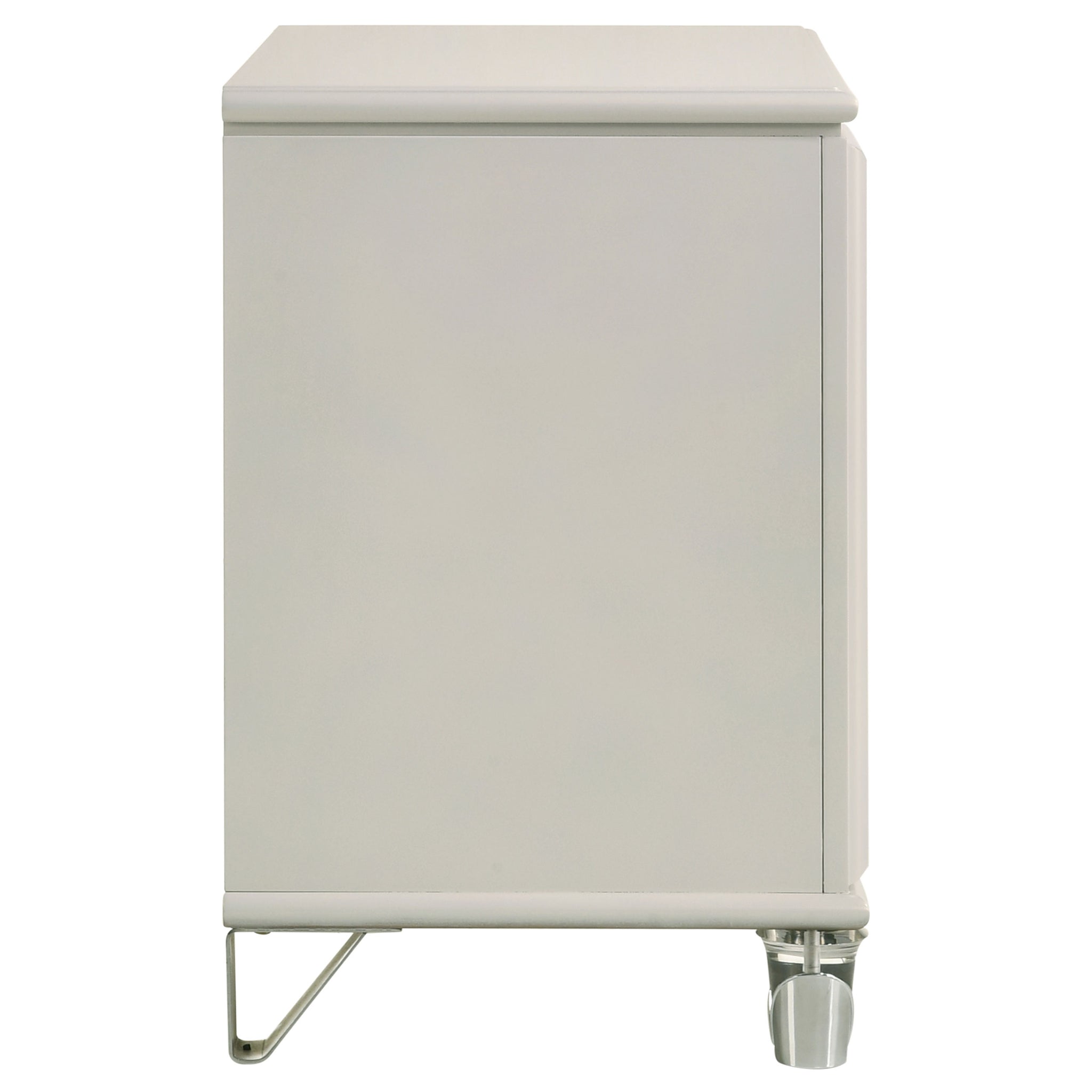 Elevate your nighttime routine with this stylish 2-drawer nightstand, a perfect blend of form and function. The pearl white finish and diamond star design on the drawer front offer a touch of glamour, while the chrome metal pulls add a sleek contrast. Featuring a top drawer with cord management access, this nightstand is designed to keep your devices neatly organized. The acrylic legs and chrome tulip-shaped caps provide a unique and elegant touch. Experience convenience and style right by your bedside.