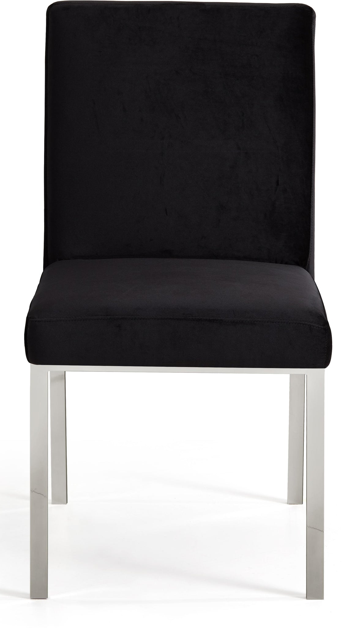 Make dinnertime a stylish affair when guests are seated in this Opal Collection black velvet dining chair from Meridian Furniture. The back of the chair features an intertwined sculptural design with a geometric motif for a modish effect that increases the wow factor in your dining space. Thick, plump seat and back cushions make sitting more comfortable, and each cushion is topped in crushed plush navy velvet for a luxurious touch and soft feel against the skin. The chair's base and back feature stainless steel construction with a chrome finish for a contemporary vibe and sturdy support.