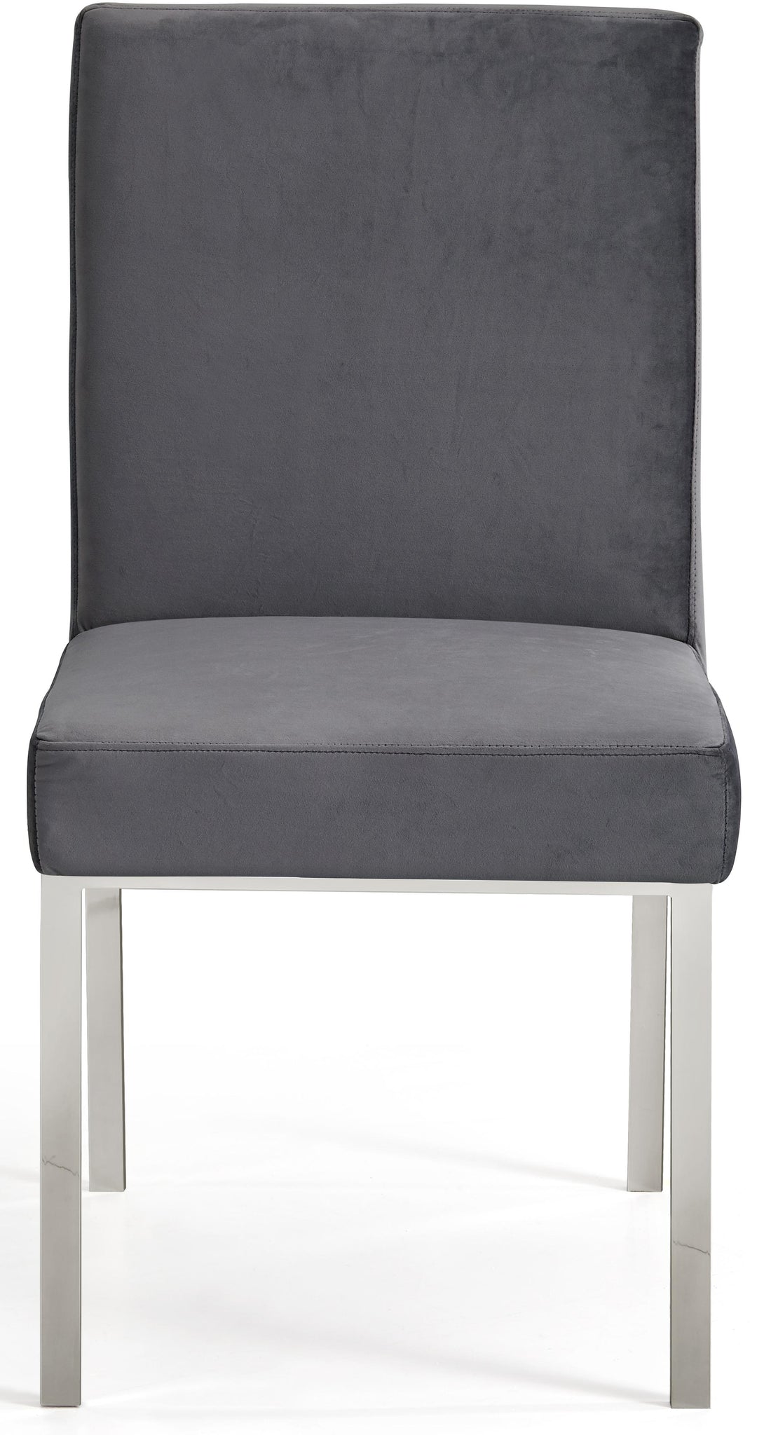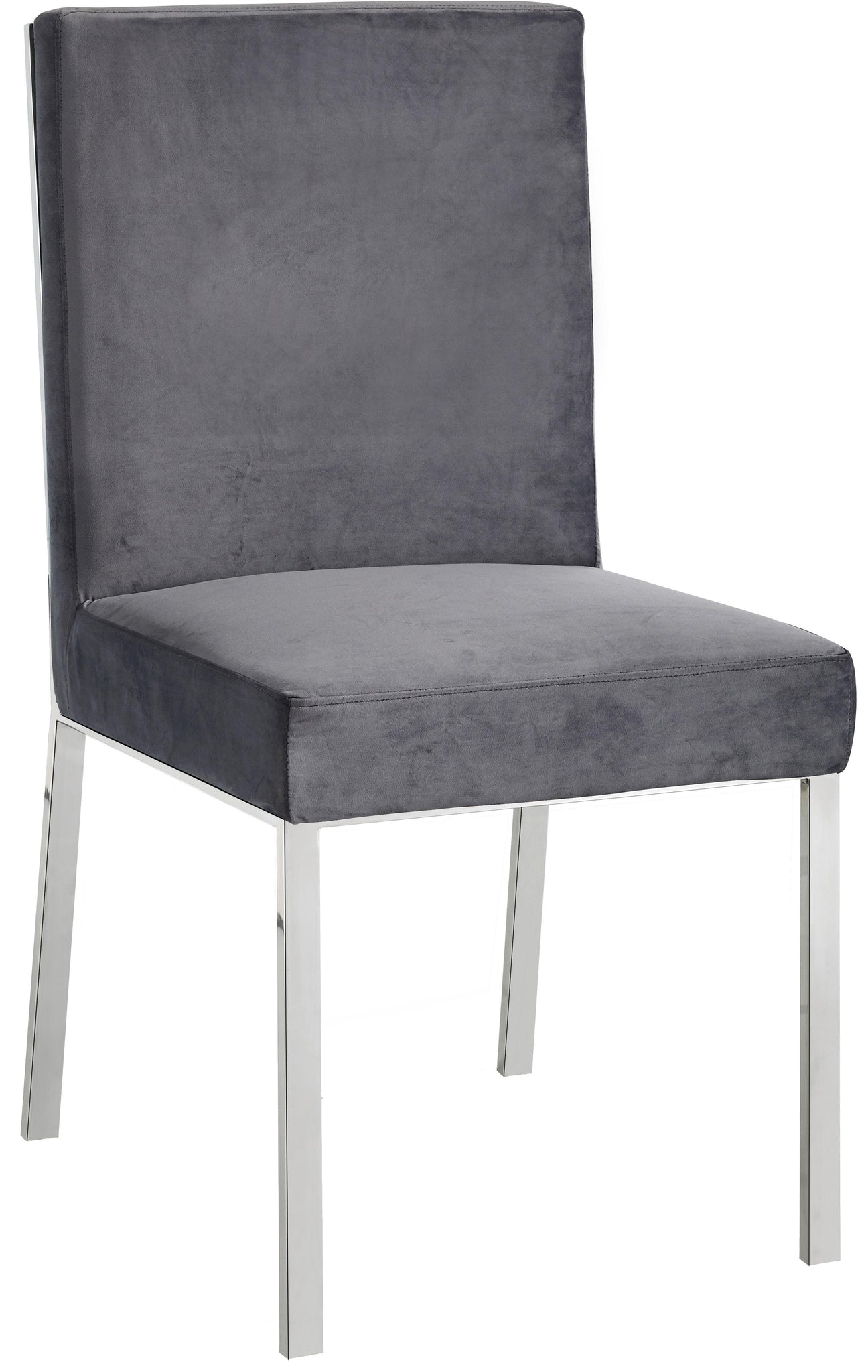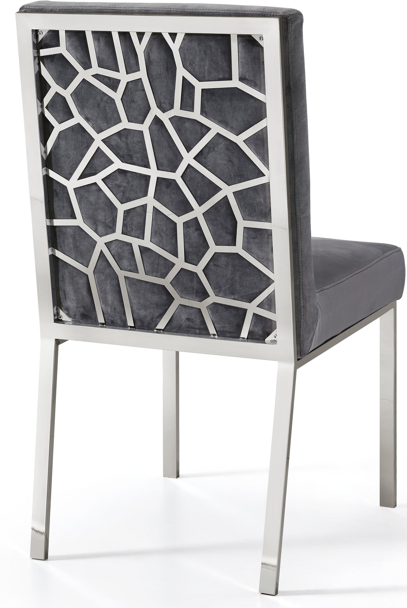 Make dinnertime a stylish affair when guests are seated in this Opal Collection grey velvet dining chair from Meridian Furniture. The back of the chair features an intertwined sculptural design with a geometric motif for a modish effect that increases the wow factor in your dining space. Thick, plump seat and back cushions make sitting more comfortable, and each cushion is topped in crushed plush navy velvet for a luxurious touch and soft feel against the skin. The chair's base and back feature stainless steel construction with a chrome finish for a contemporary vibe and sturdy support.