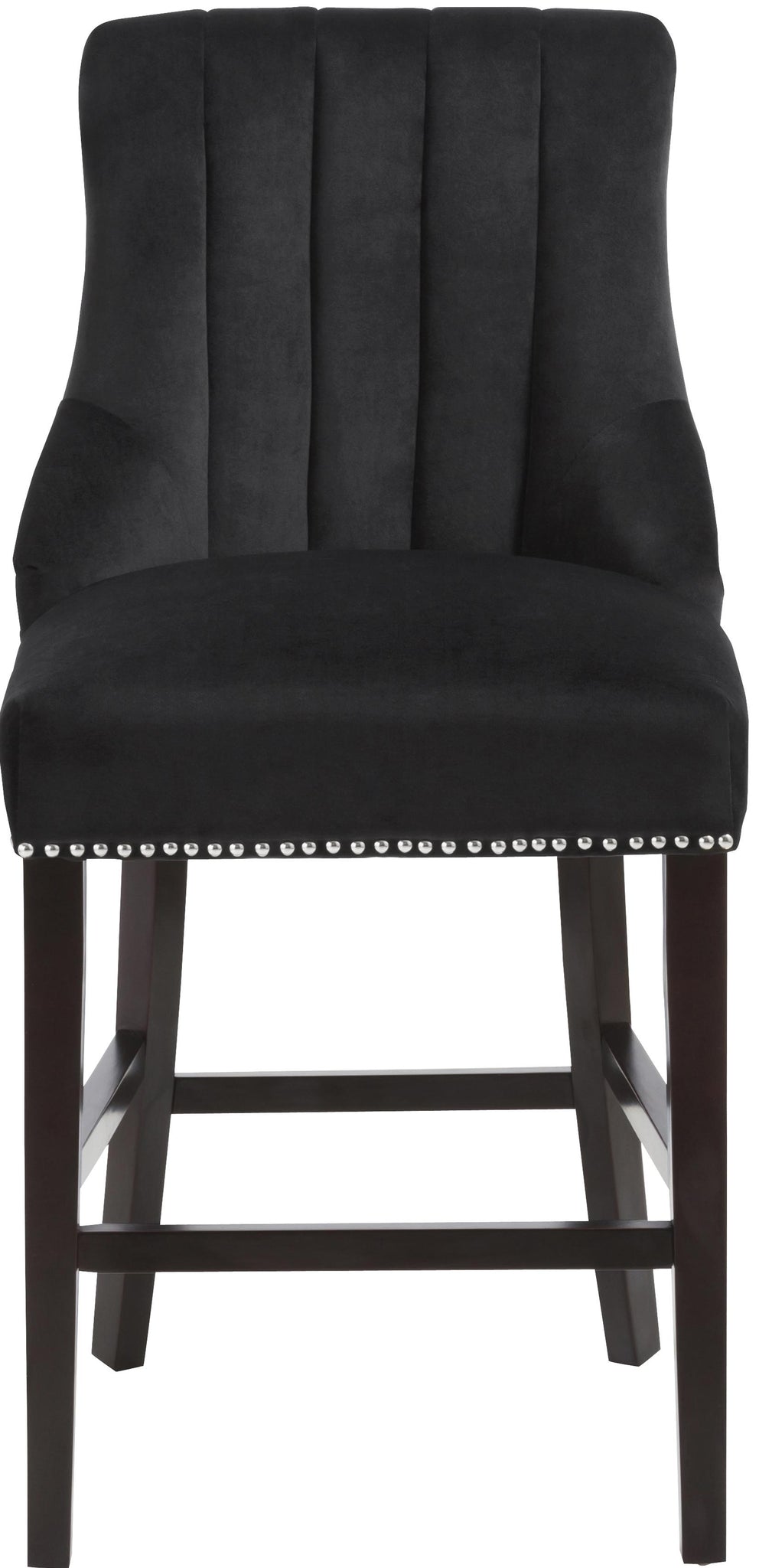 Add this Oxford Velvet Stool to your home bar or kitchen counter to seat guests comfortably and in chic fashion. The black velvet upholstery is thick and durable and has a slight sheen for a touch of glam. The back of the seat has deep button tufts for a posh look, while the front features smooth velvet upholstery for sleek comfort. The base is made from wood with an espresso finish and has a foot rail for extra support and comfort as you sit.