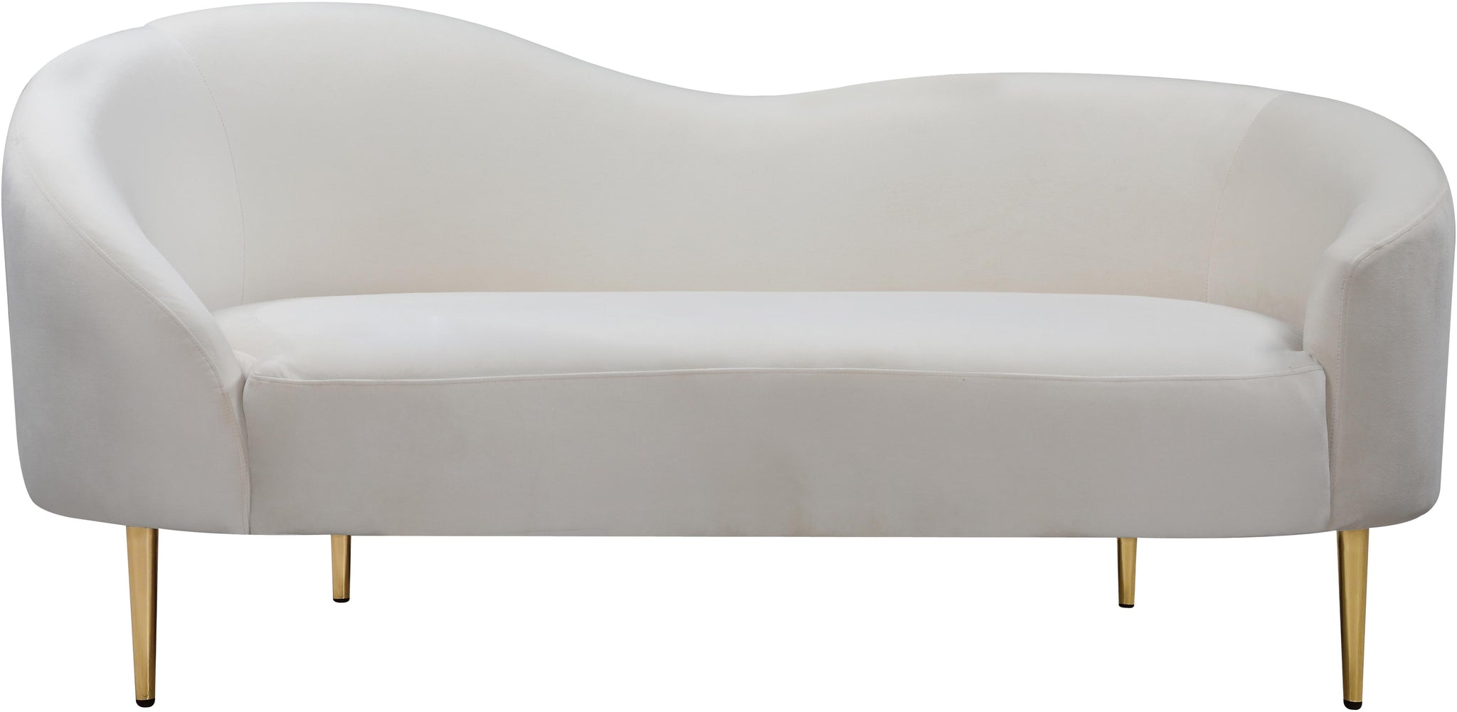 Get comfy while remaining chic in this elegant Ritz cream velvet loveseat. Plush cream-colored upholstery provides a soft texture that is pleasing to the senses, while its curved design offers a contemporary touch to your home furnishing. Gold metal legs complement the loveseat's sophisticated cream color, creating a gallant piece anyone would be proud to display in their home.