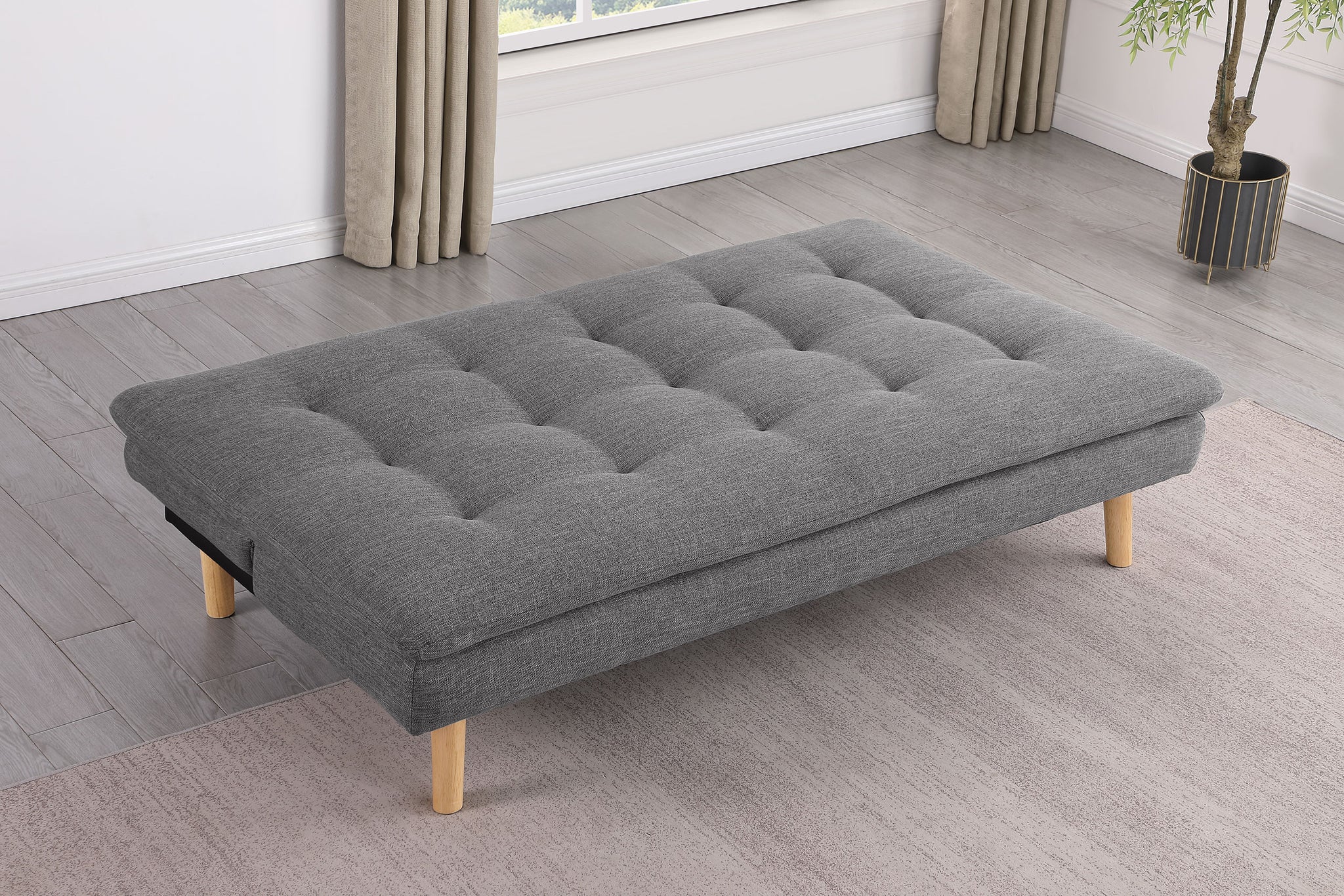 Create maximum flexibility in your space with a modern sofa that folds flat to create a bed when guests spend the night. The sofa is a minimalist design complete with an armless silhouette. It's upholstered in a medium gray, offering chic style in a den or home office. Its foam cushions is gently tufted to add depth and texture. The sofa rests on tapered, splayed legs with a natural wood finish, adding a light, airy final touch.