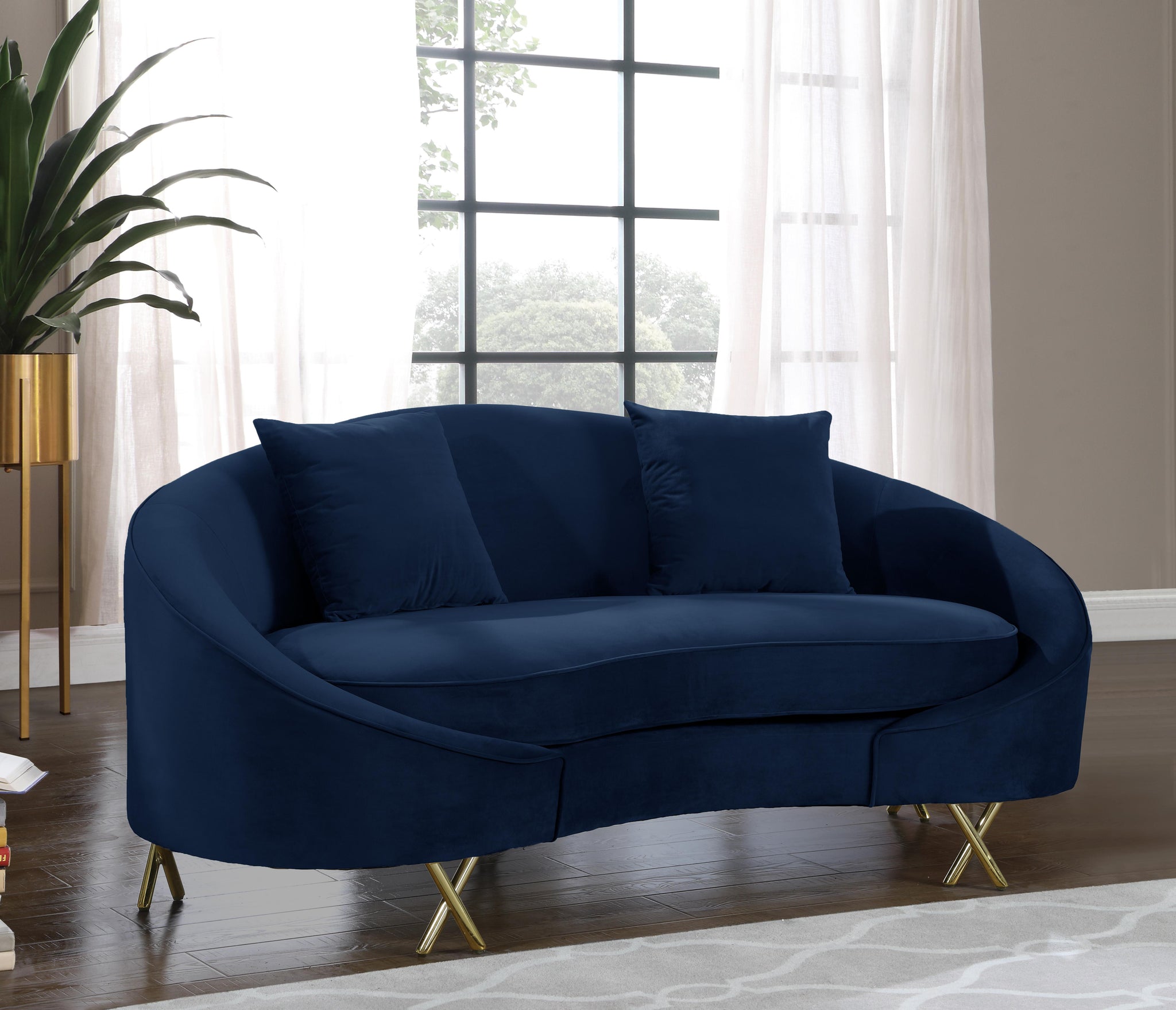 Give your living space a bold touch with this Serpentine navy velvet loveseat. This roomy chair features lush navy velvet upholstery that offers a soft, comfy place to rest that is pleasing to your senses, while its rounded, contemporary design mixes style and comfort. Gold steel legs complement the loveseat's navy color, giving it an elegant touch that?��Ǩ�Ѣs perfect for your chic home decor. Place this loveseat in a corner or next to an end table for additional seating options in your living room or den.