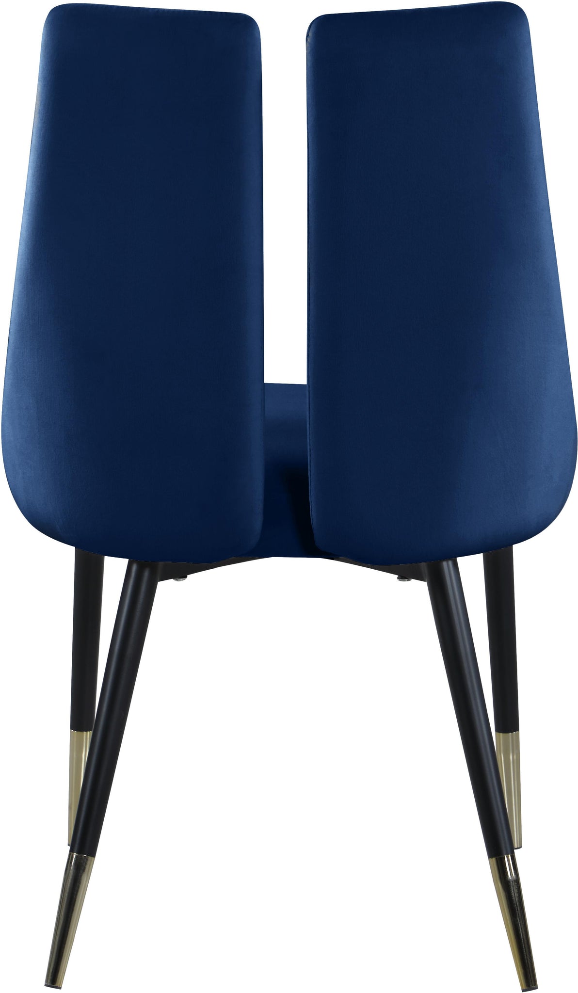 It doesn���t get more modish than this! This Sleek velvet dining chair is the bees knees when it comes to contemporary design with its sculptural back and its clean lines. The chair is covered in soft navy velvet upholstery material for a look that���s modern and sophisticated. Matte black iron legs with gold tips gives the chair a hint of elegance.