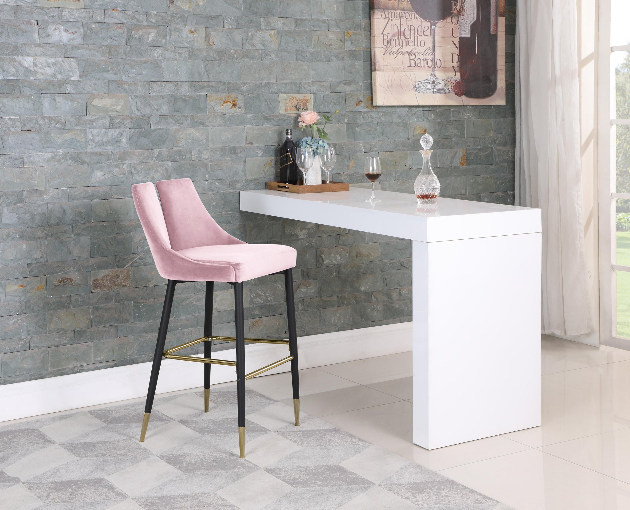 Define your home bar or kitchen counter in style with this Sleek Bar Stool from Meridian Furniture. It features a bar height design for easy integration with your existing setup, and it���s upholstered in soft pink velvet material for a luxe look. The contemporary design makes this stool well at home in modern spaces, and the matte black metal legs with gold tips add to its modish appearance in your room.