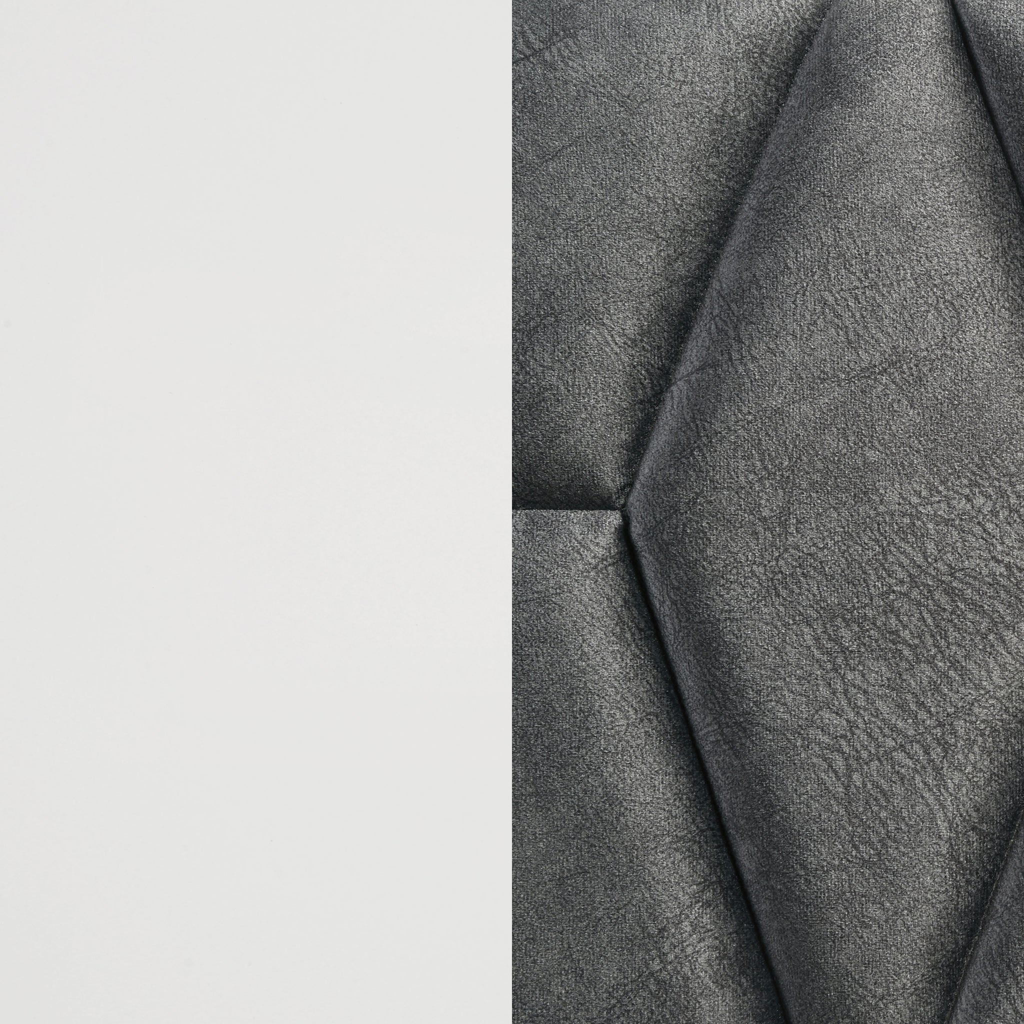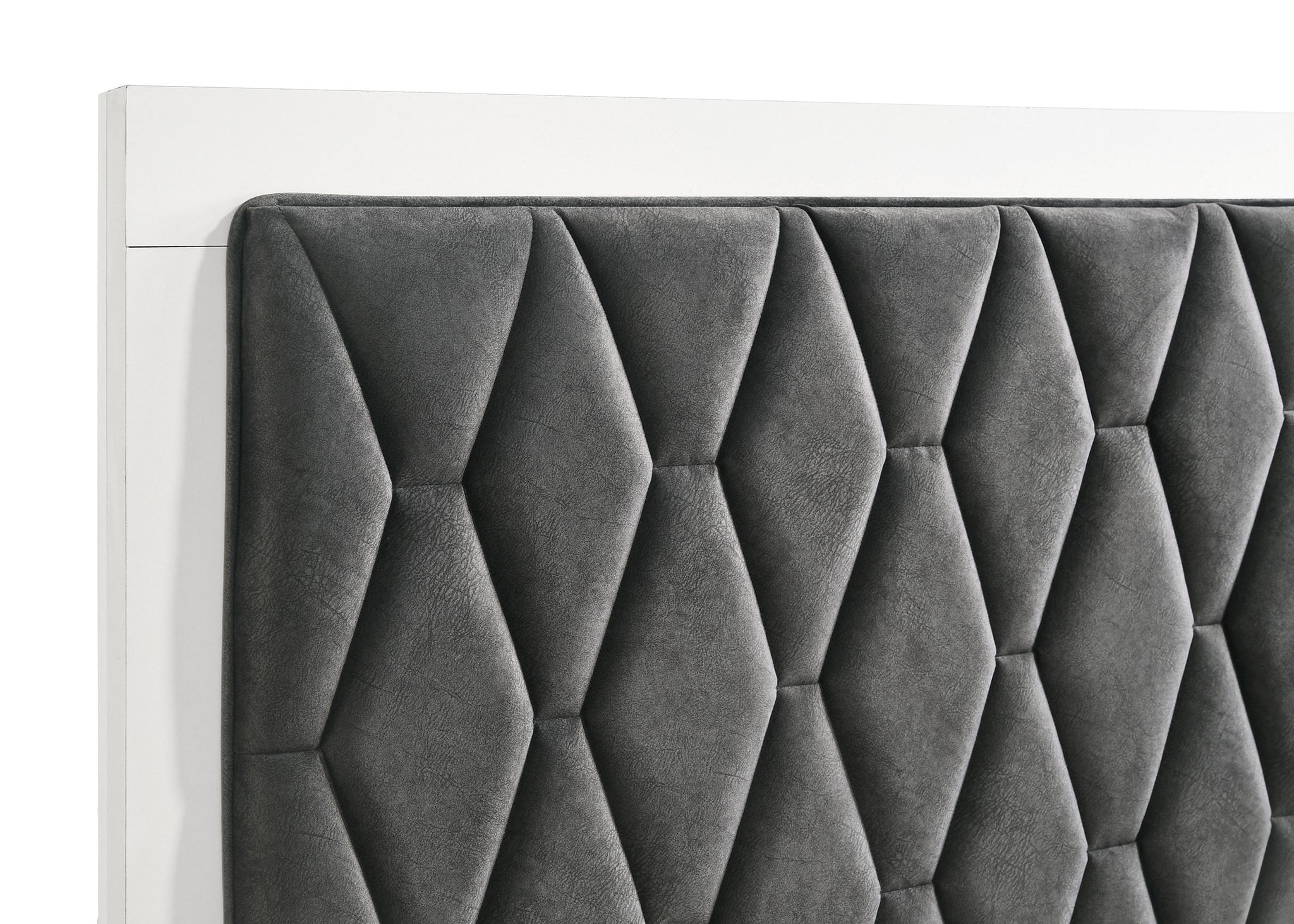 Reimagine your bedroom retreat with the crisp, clean appeal of a modern four-piece bedroom set. Its clean, precise style is emphasized with sleek silhouettes and a bright white finish. The set centers on a chic bed with a tall headboard and low footboard, offering fresh style with geometric tufting in dark gray padded upholstery. Black finish legs complete the bed and bring cohesive style to the set, matching bases and hardware on the dresser and nightstand. The dresser offers plenty of storage and includes a framed mirror on top, adding bright reflectivity to your bedroom ensemble.