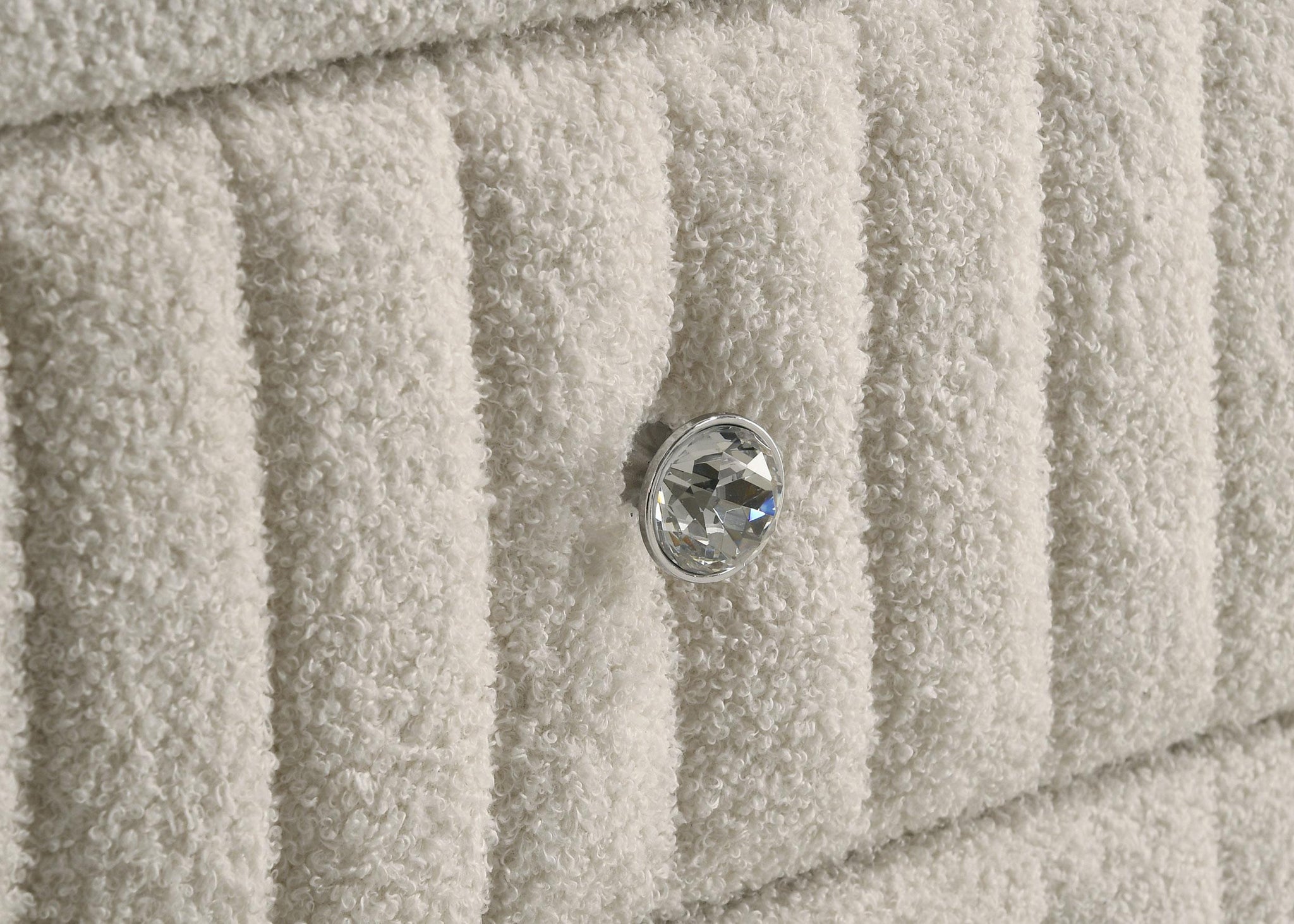 Add a touch of elegance and functionality to your bedroom with this stunning oval nightstand. The plush bouclé upholstery, adorned with sparkling acrylic button tufts, offers both a luxurious feel and eye-catching detail. Two spacious drawers provide ample storage for your essentials, while the clear tempered glass top adds a sleek and modern finish. The acrylic knobs complement the tufted design, bringing a cohesive and polished look to your space. Perfect for keeping your nighttime necessities close at hand, this nightstand effortlessly blends style and convenience.