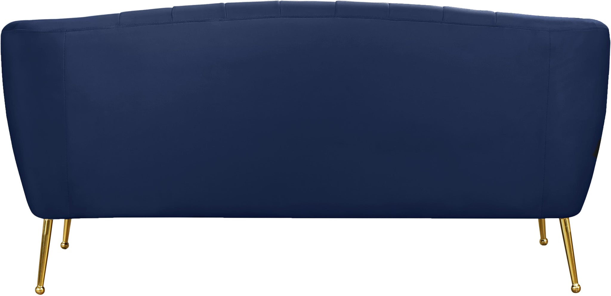 Dress up your living room space with this Tori Velvet Loveseat. This plush loveseat features sleek navy velvet upholstery that covers every square inch, adding a sumptuous and svelte look to your room. The gold legs with a ball design on the foot adds to the elegant look of this pretty chair, and deep channel tufting adds loft to the back and arms for a lavish feel when you sit down to relax and unwind at day���s end.