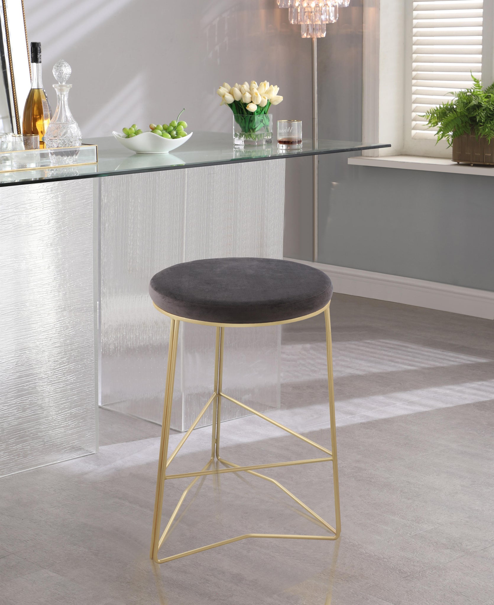 Remake the look of your kitchen counter with the addition of this Tres velvet counter stool. This handsome stool is both elegant and simple at the same time, making it a great addition to minimalist d?�cor. The soft grey velvet upholstery on the plump seat cushion is welcoming and comfortable, so you can enjoy sitting to the max. The stool rests on rich brushed gold metal legs for a solid, sturdy foundation.