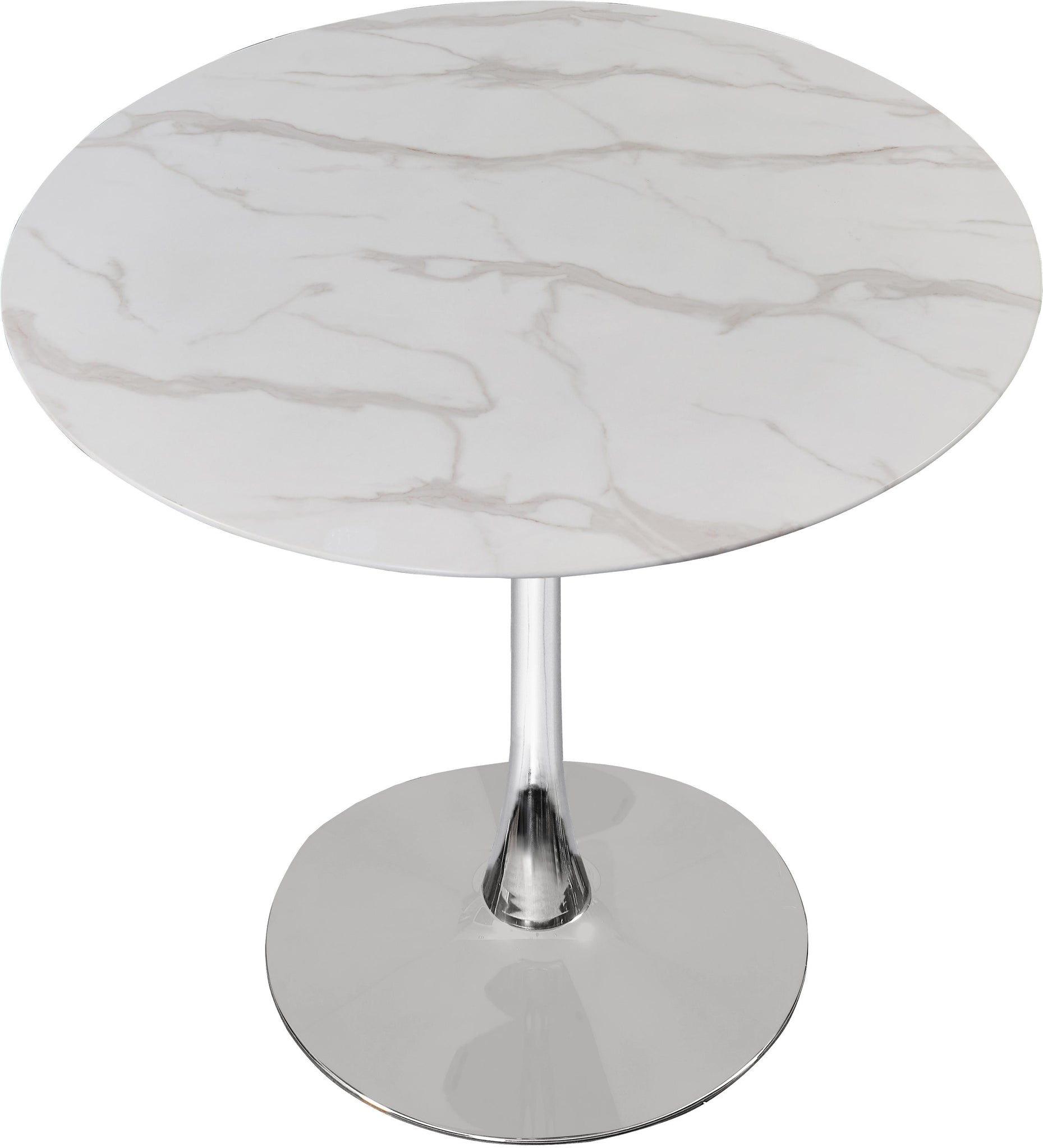 Add the Tulip 36" dining table to your kitchen, den or office to enjoy its petite size and elegant lines. The tabletop is made of 10MM thick glass with a glamorous marble veneer. A shiny silver pedestal base adds to the appeal of this gorgeous piece, and lets it fit into smaller spaces comfortably. Choose from a wide array of available matching chair styles to complete your contemporary style d?�cor.