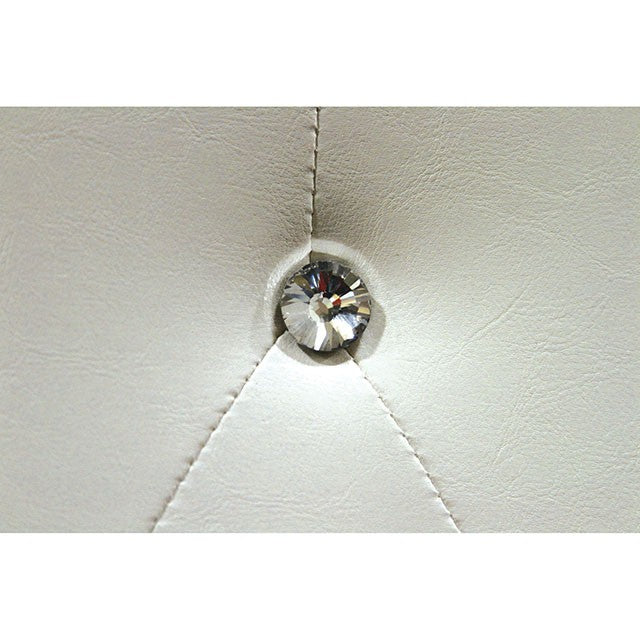 This black padded leatherette bed helps bring about the beauty of this set. Crystal-like acrylic buttons adorn the tufting in the headboard, while matching case goods mirror the simplicity of the bed with straight lines and simple silhouettes. Available in five sizes.