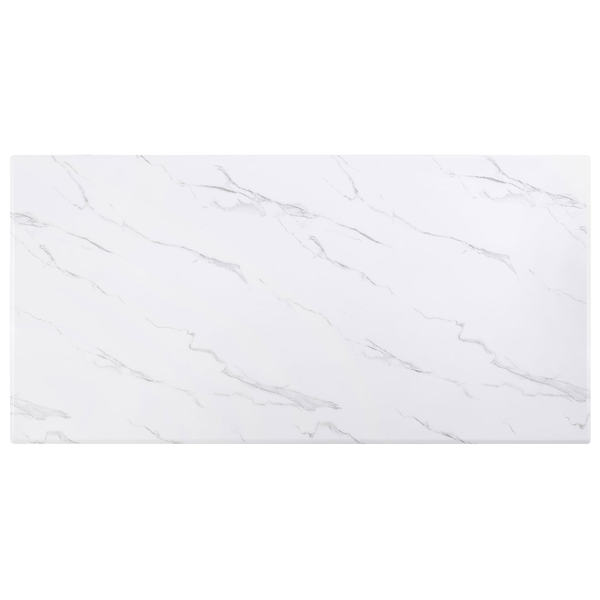 Elevate your dining room with the essence of modern luxury embodied in this white and grey marble veneer dining table. The table, constructed with engineered marble veneer, china white marble, and MDF, features a gleaming white marble table top adorned with intricate patterns and veining, adding a sense of dimension and texture. The gold finished crisscross stainless steel legs not only provide sturdy support, but also offer a touch of luxury and contemporary style.