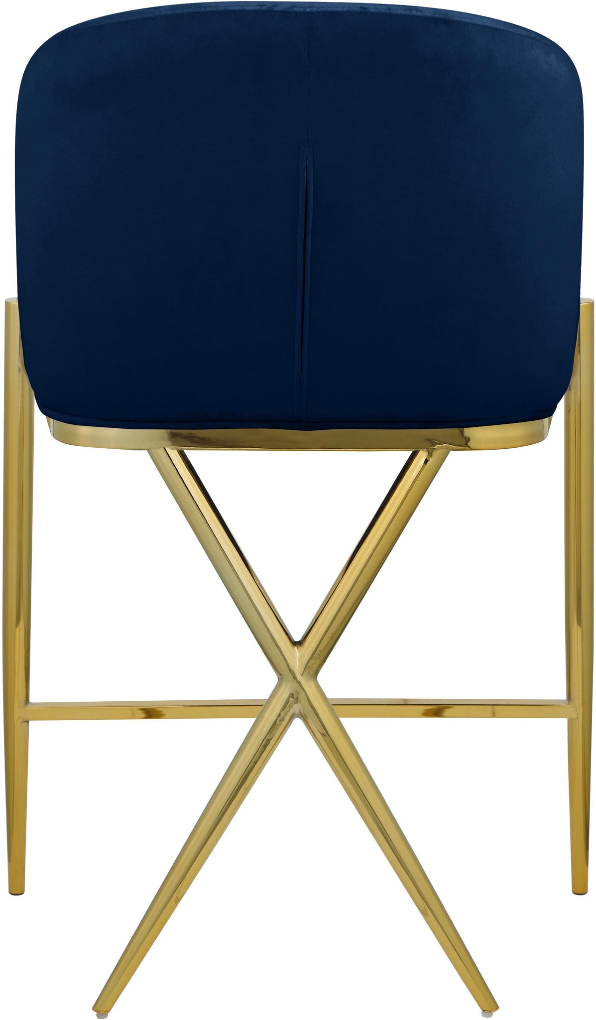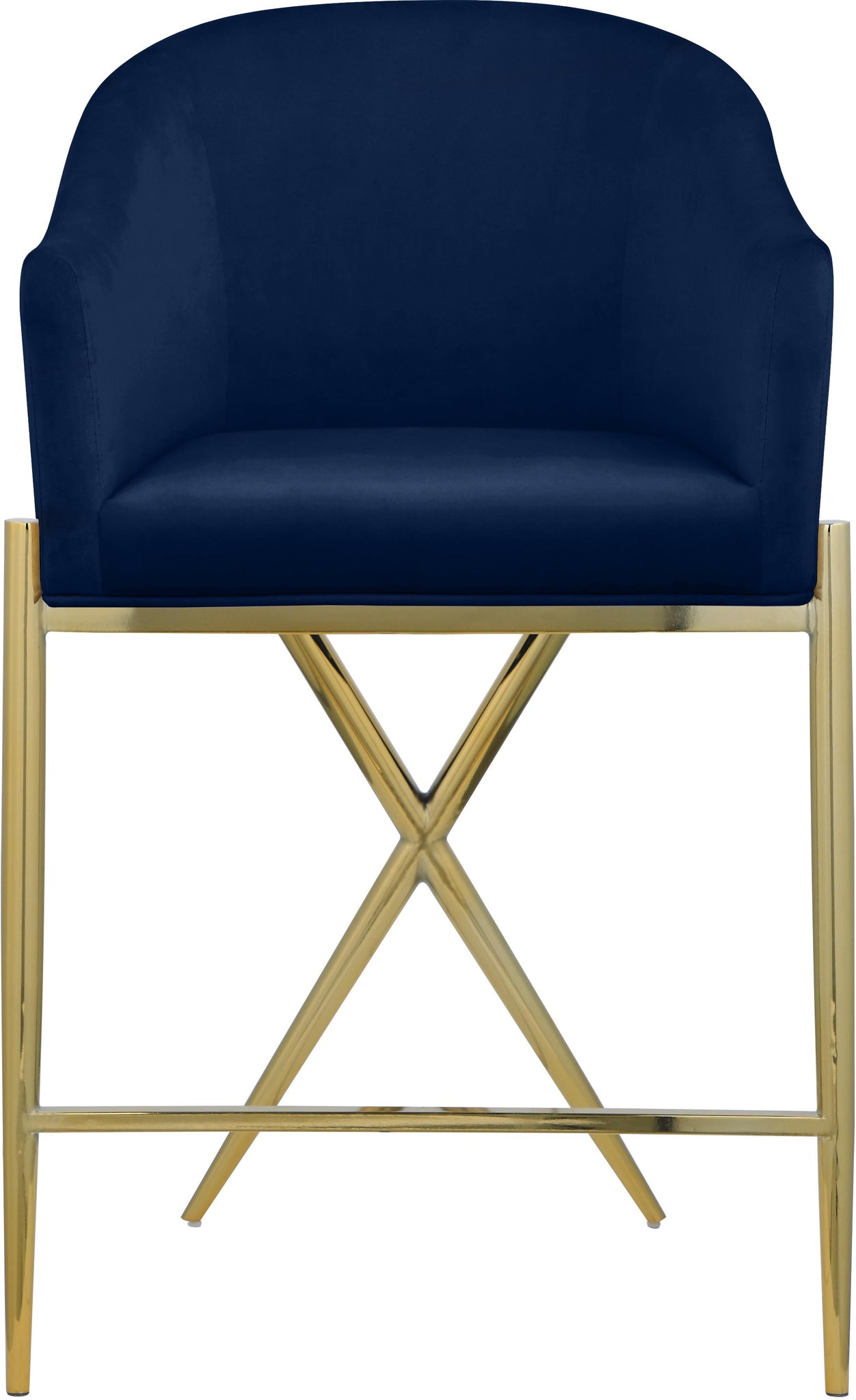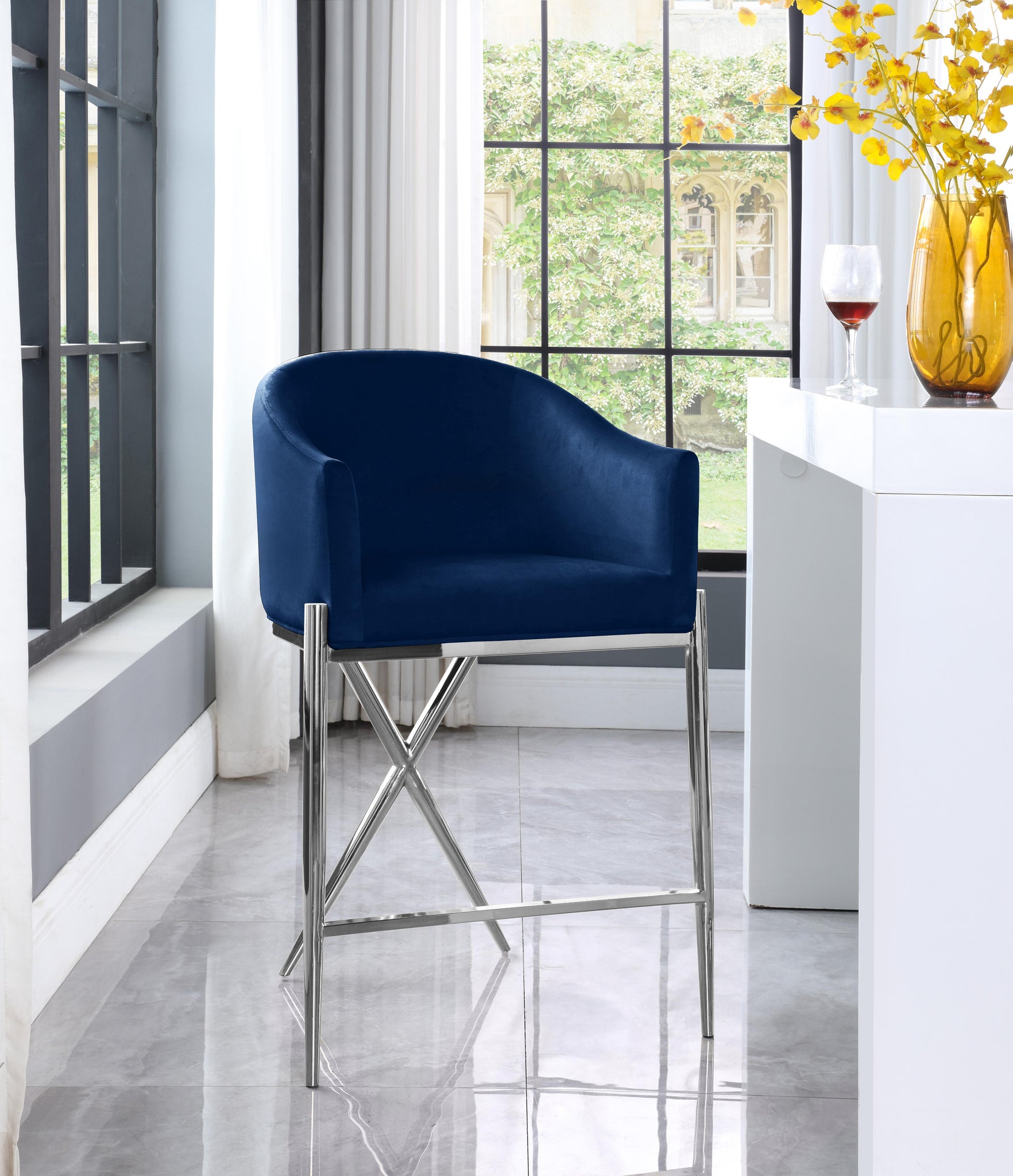 Mosey up to the home bar and find comfortable seating awaits when you have this Xavier counter stool to turn to. This stool features a rich navy velvet upholstered barrel-style seat and back cushion and rests on chrome metal legs with a metal frame for durability. This counter-height stool is just the thing to bring your modern counter or home bar setup into contemporary style.